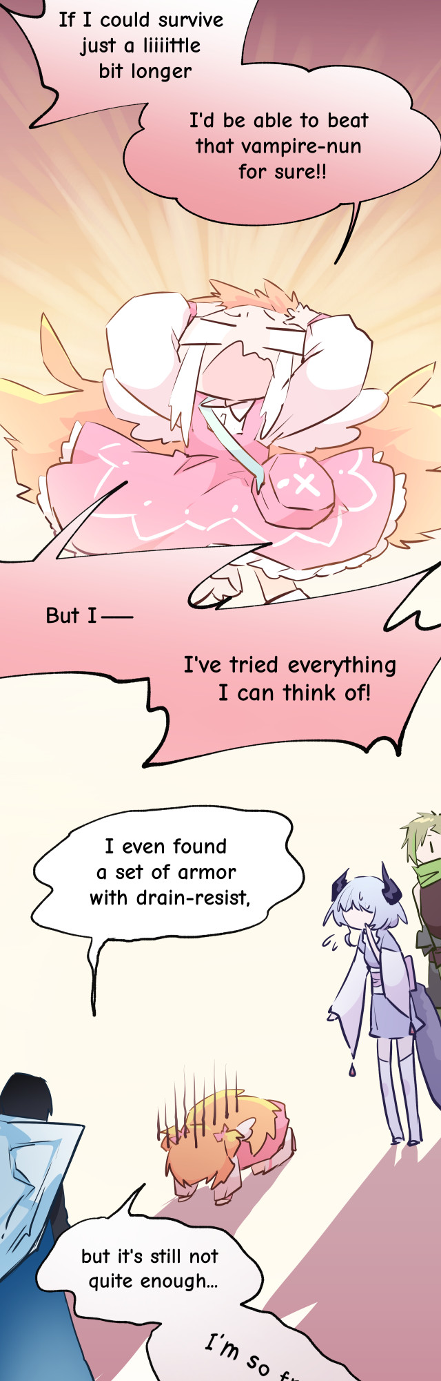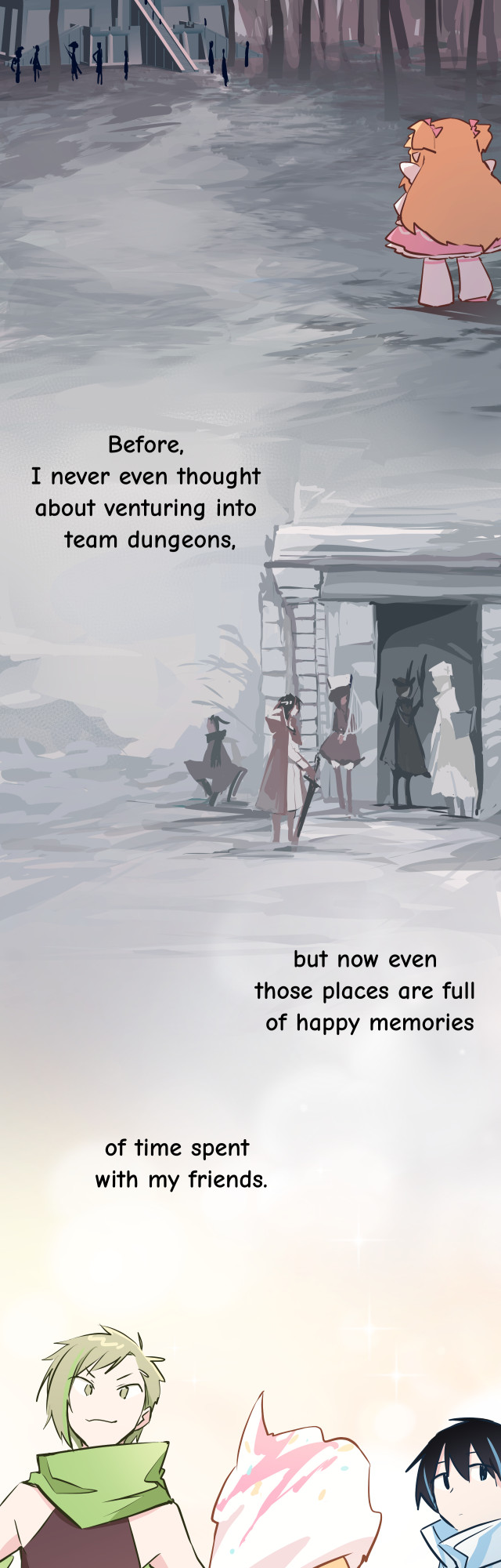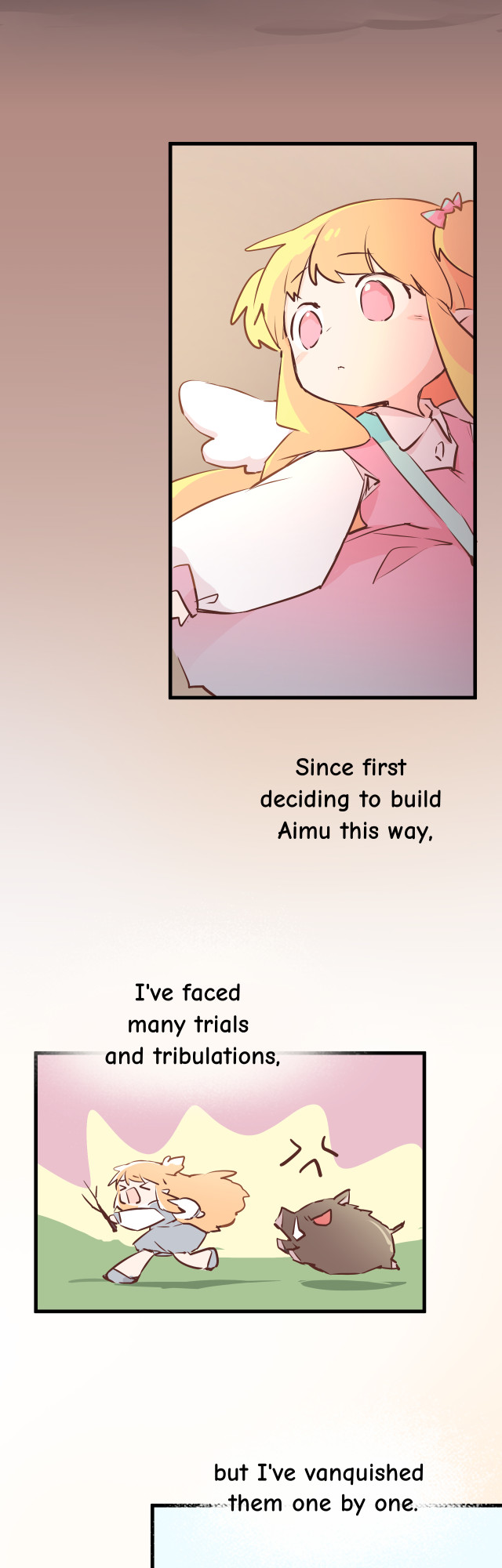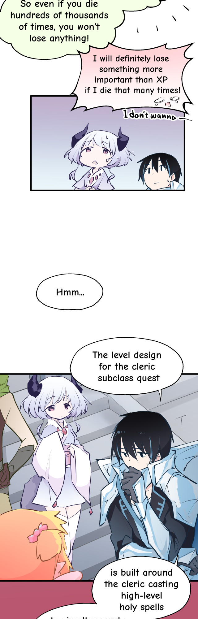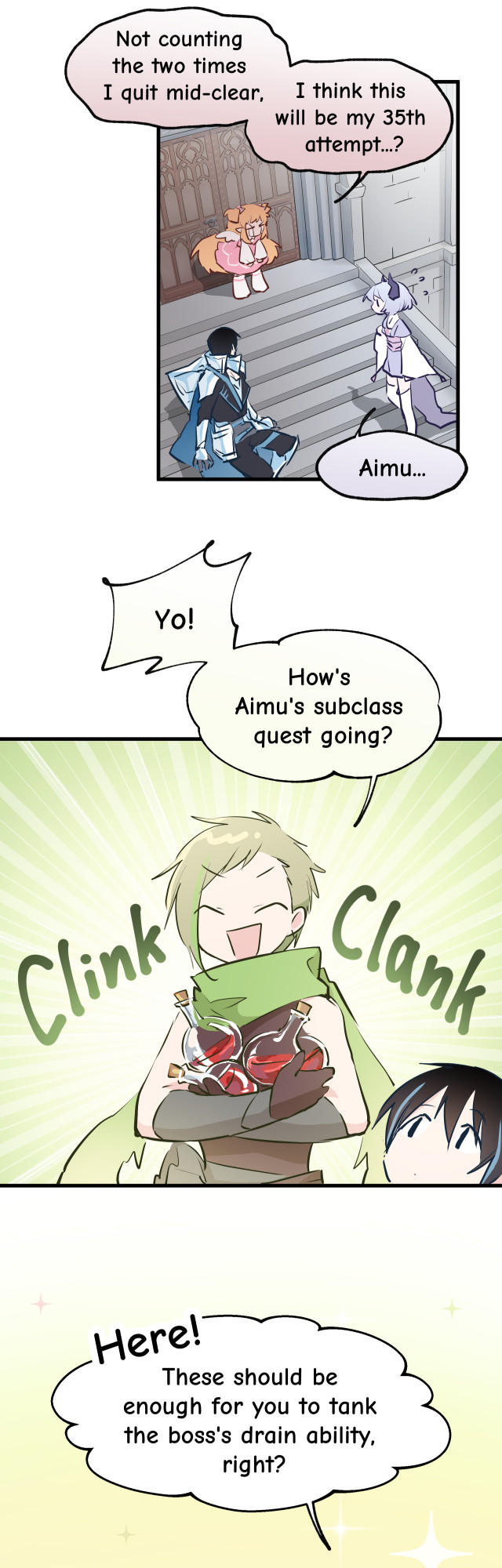 Aimu wants to finish her subclass mission and go back to running dungeons with her friends, and questions whether she ought to just give up her insistance on being a pure attack cleric... Thank you Gamu and Bunny(apocalypse) for your dedicated work on translation. Bunny helped me come up with a completely new chapter title, which I feel is even better than the original, Chinese one, hahaha.