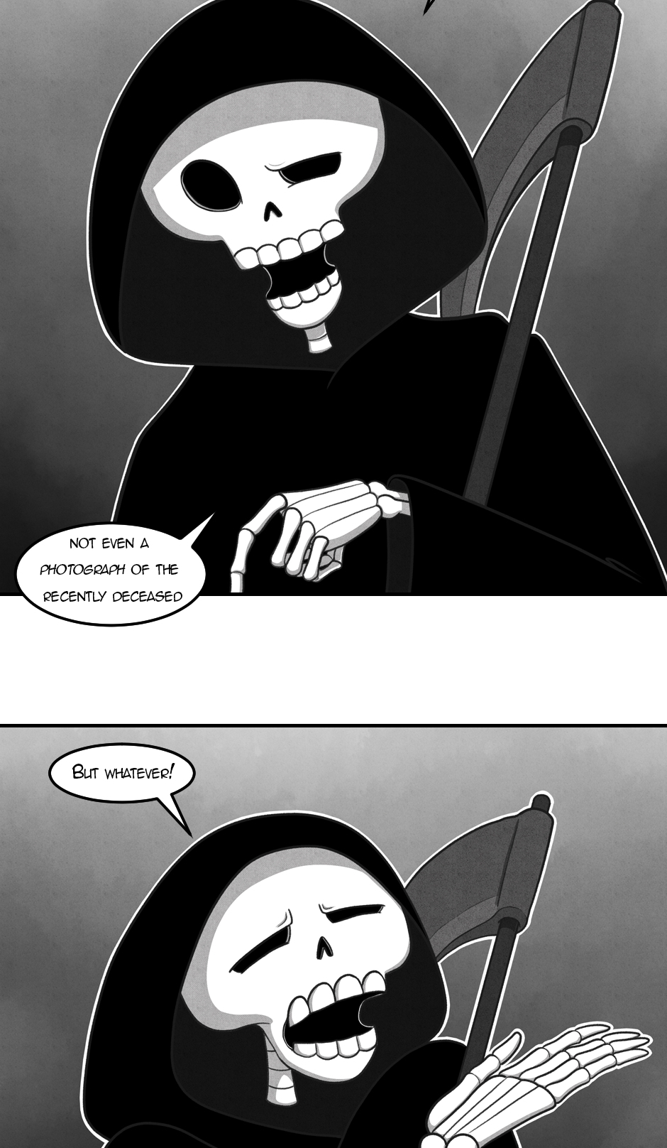 This series is a prequel to Side Quest, and follows our rather quiet but passionate 2ft tall Irish Gentleman Skeleton named Numskull, and his backstory from start to finish. This story is best summed up as a story about Love, Death, and Loss.