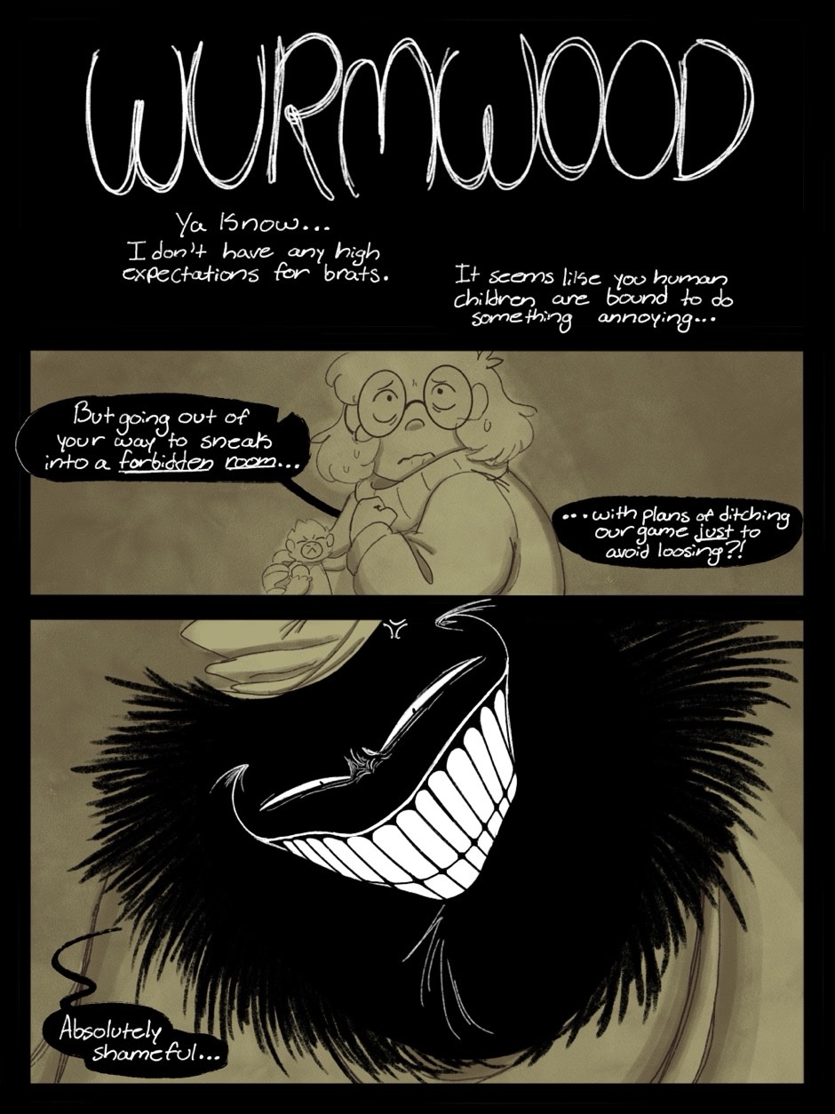 A little girl name, Hazel, who has to move in with her aunt, Amber, due to some… unfortunate circumstances. On the very same night she moved in, Hazel found a large black and white door within the basement of the house. Behind it was an entirely different part of the house. Hallways upon hallways covered in overgrowth and rotting wood with no sign of ending. The Wurmwood. She explored the strange world with curiosity and wonder before running into the main resident of the Wurmwood. A shapeshifting monster that goes by many names, but is mostly known for being The Boogeyman.