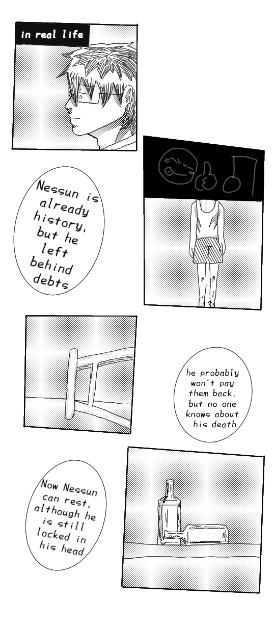 Nessun is 24 years old and has mental health issues (anxiety, depression, schizophrenia) that led to his dismissal from his job. A friend (or rather, acquaintance) of Nessun's overdose of medication led to a nervous breakdown. He committed suicide. Later, we delve into his mind and learn about his story (childhood, relationship with Leon, and more).