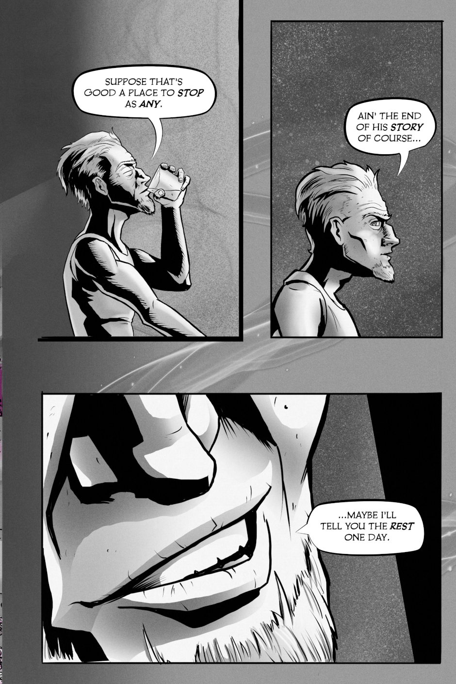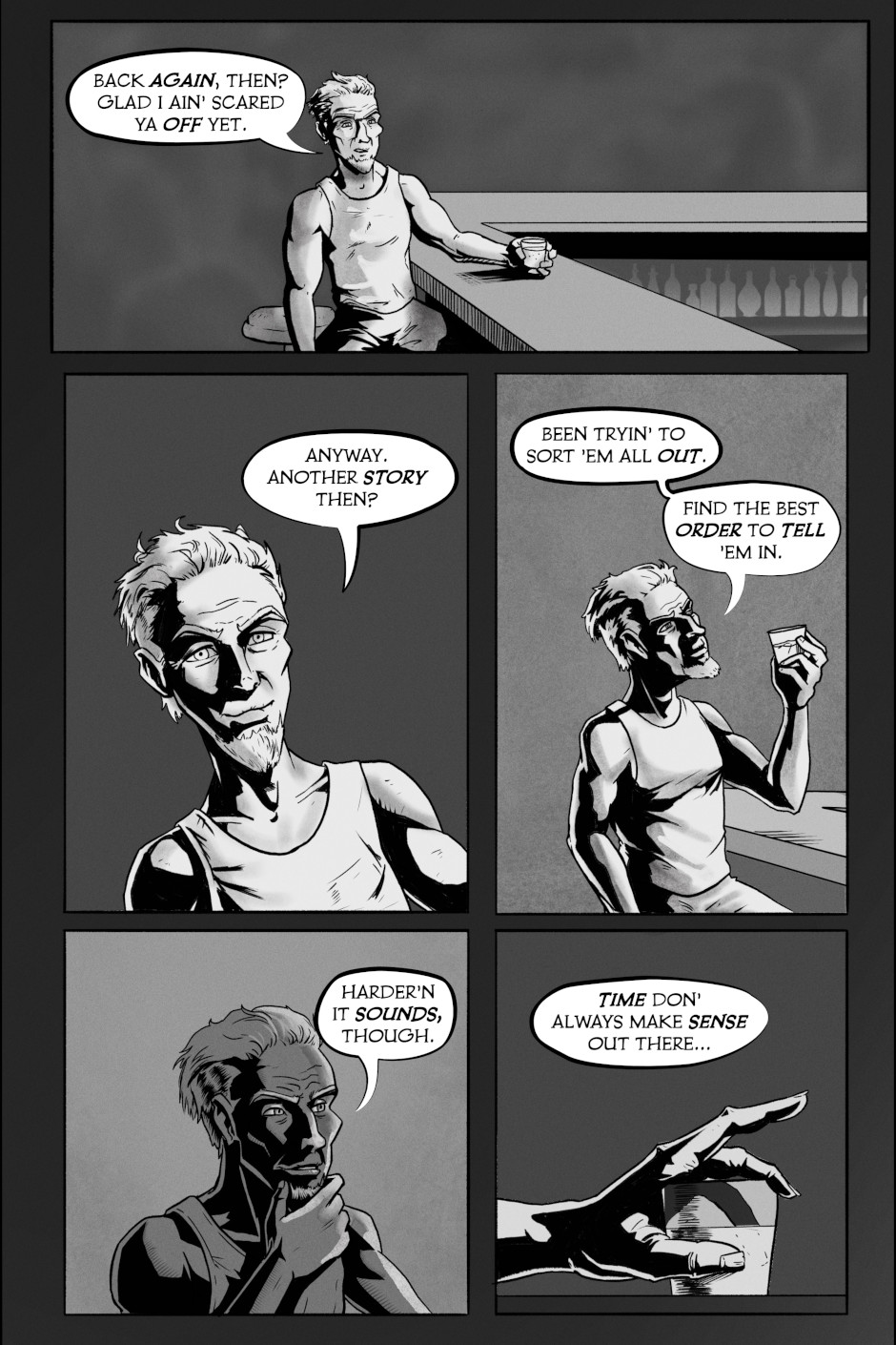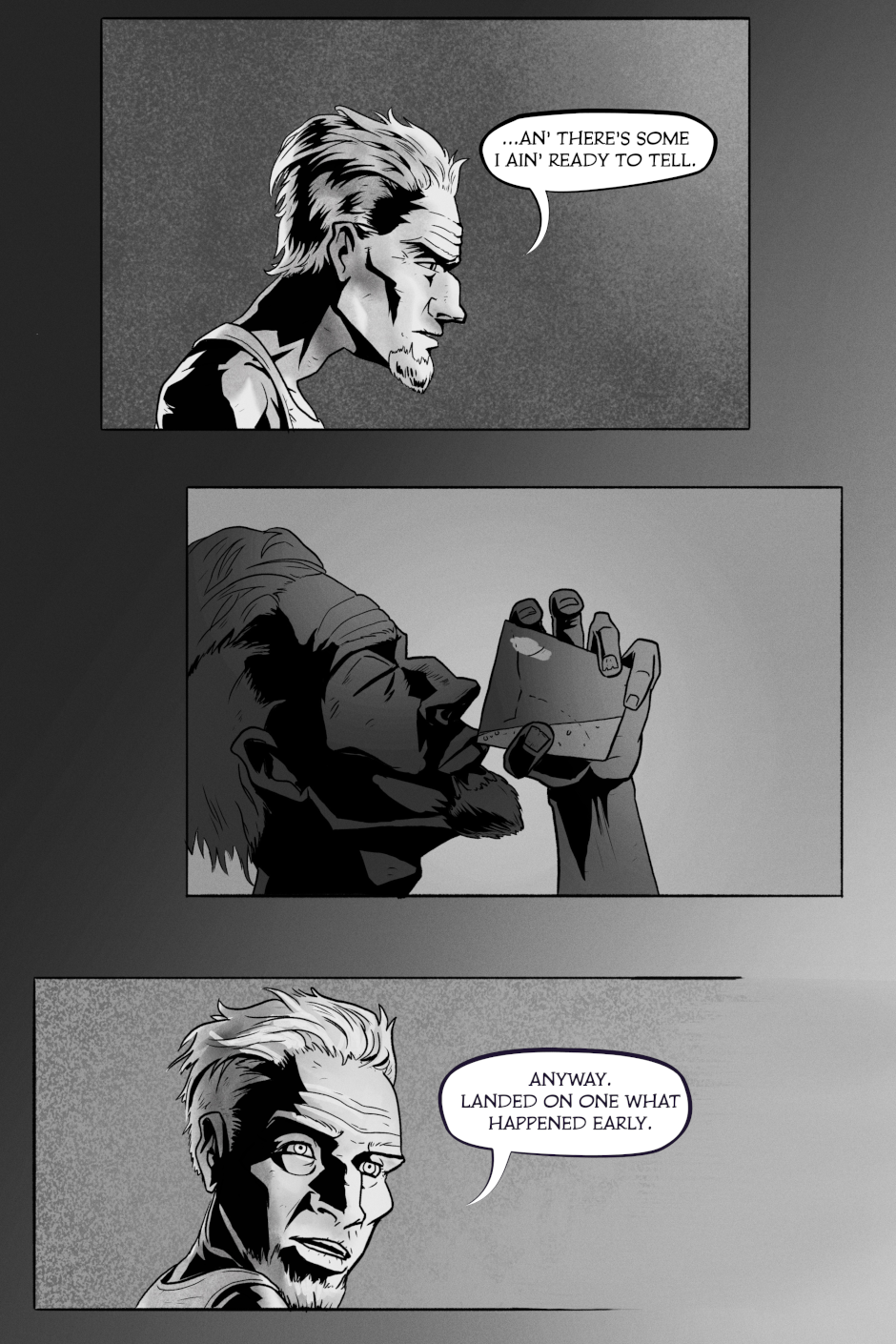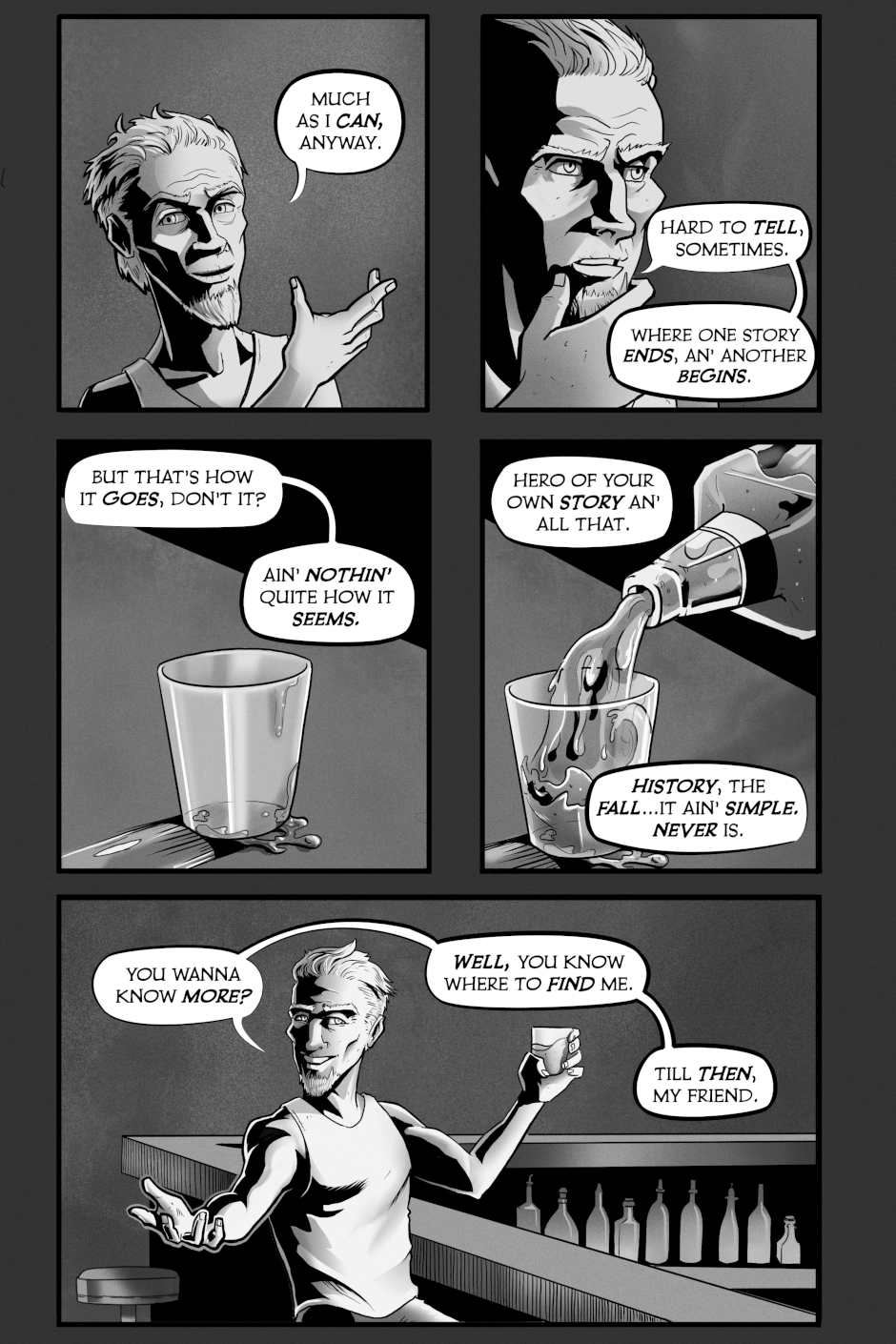 Hey. Only one reason you'd be here, eh? You want a story. You wanna know what happened before, what's out there beyond the wall. Everyone got their own ideas...Ain' none of 'em right. Course, ain' none of them wrong neither.