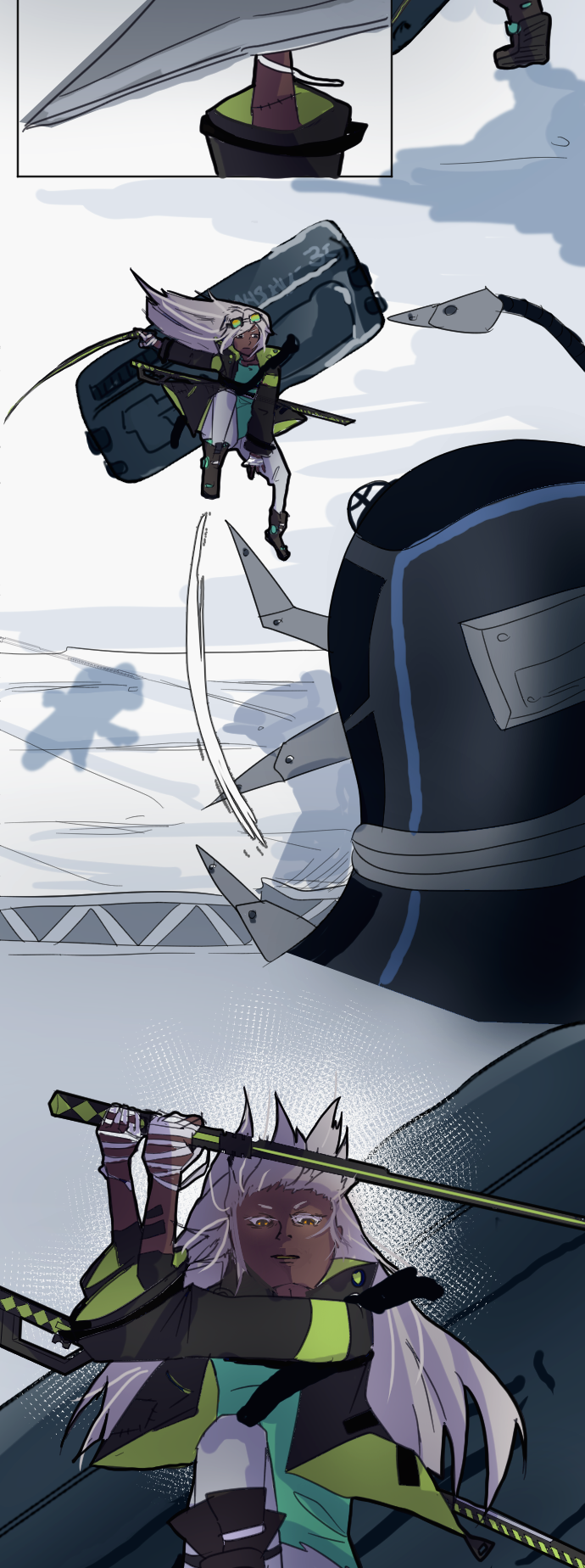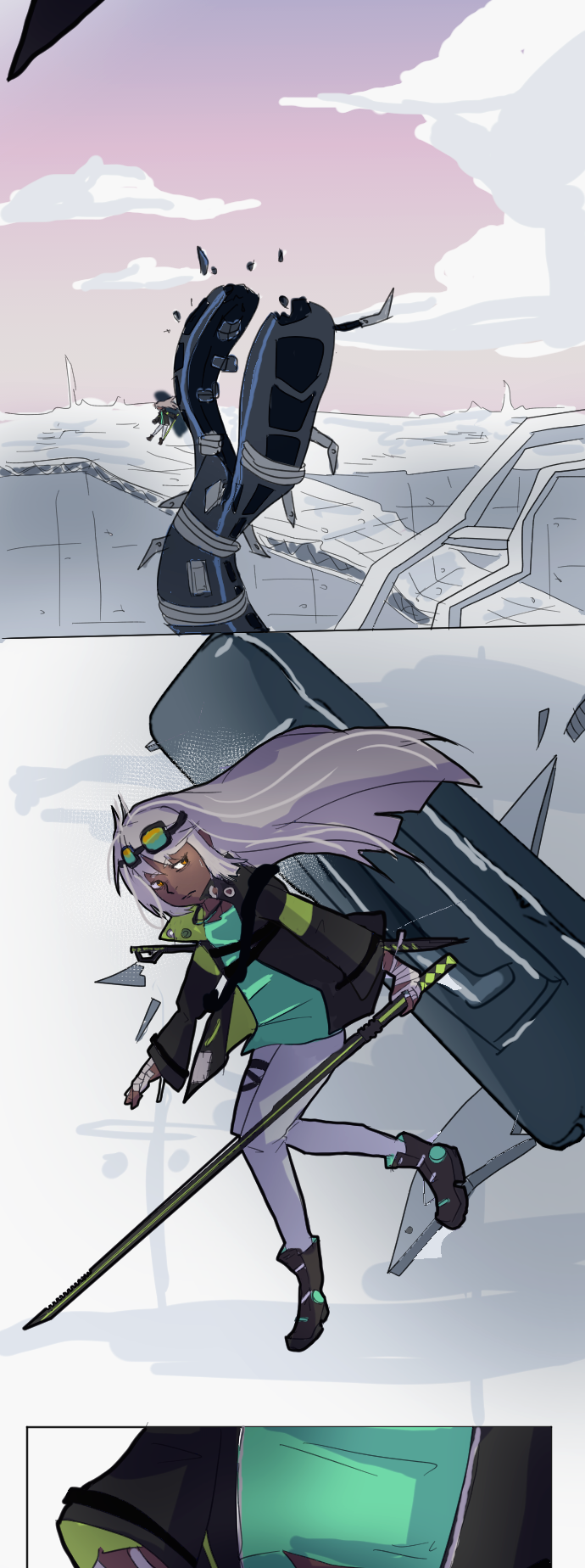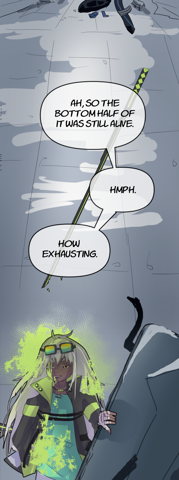 Not sure what her reaction at the end is. Even if she’s a calm/collected type, some readable reaction after having her arm chopped would’ve felt better there.