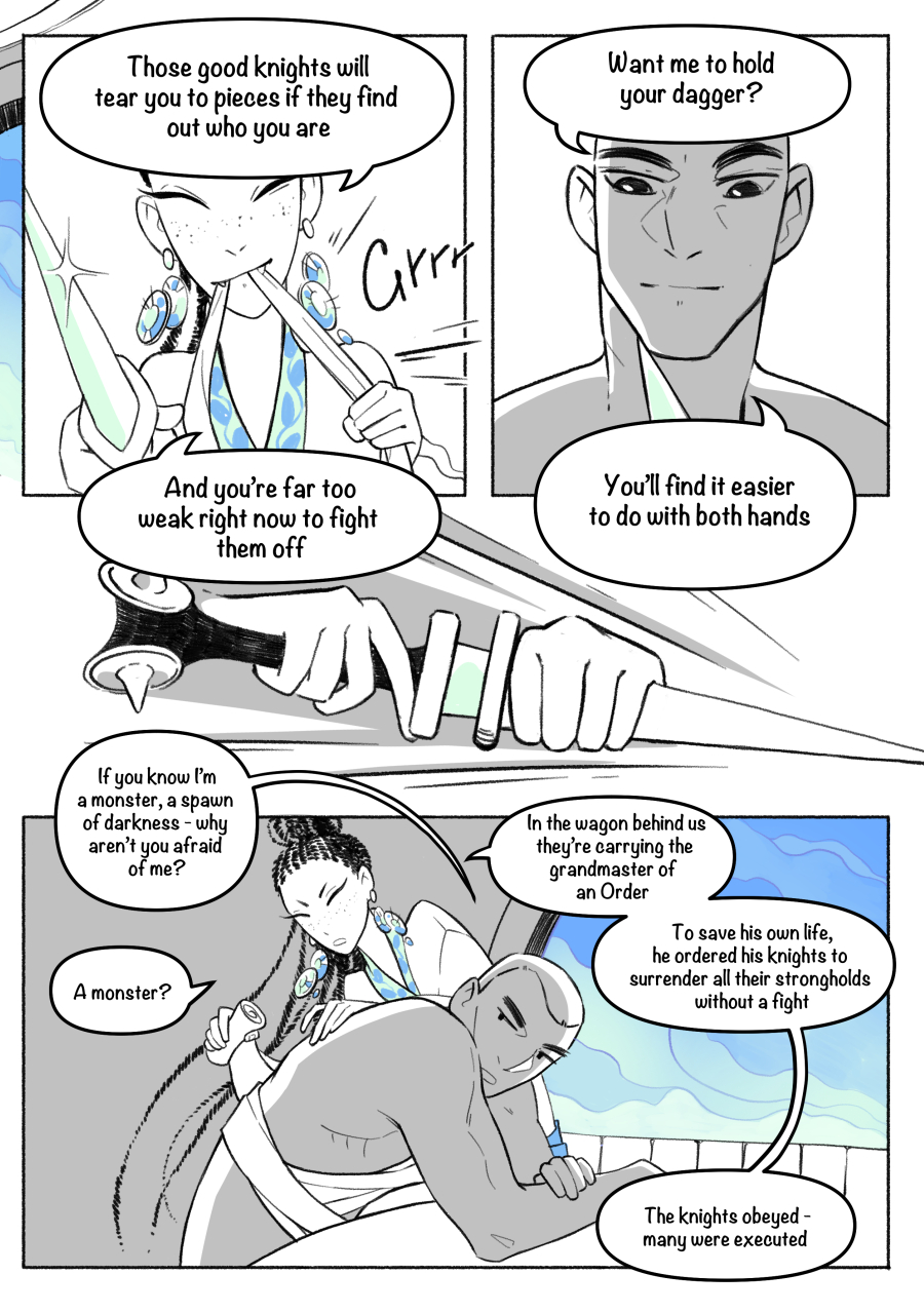 New comic pages every two weeks on Sundays. Once a month, the companion novella updates here on Tapas Novel — same story, deeper cut