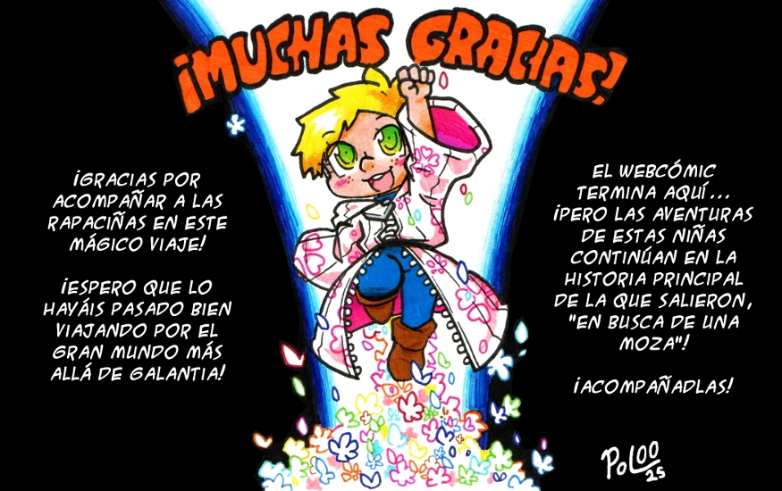 El webcómic "Rapaciñas" acaba aquí... ¡pero las aventuras de las rapaciñas no! Vuelven a "En busca de una moza", el webcómic del que salieron (y con el que han corrido paralelamente), preparándose para la saga final (que esperemos no me lleve tanto como la saga final de One Piece). El viaje de María y Leo empezó tras el cap 31 de la Moza (https://tapas.io/episode/2296577) y se han reencontrado con Shal en el 48 (https://tapas.io/episode/3635847). Pero ahora tienen todo un equipo con ellas ¡y van a dar mucha guerra!