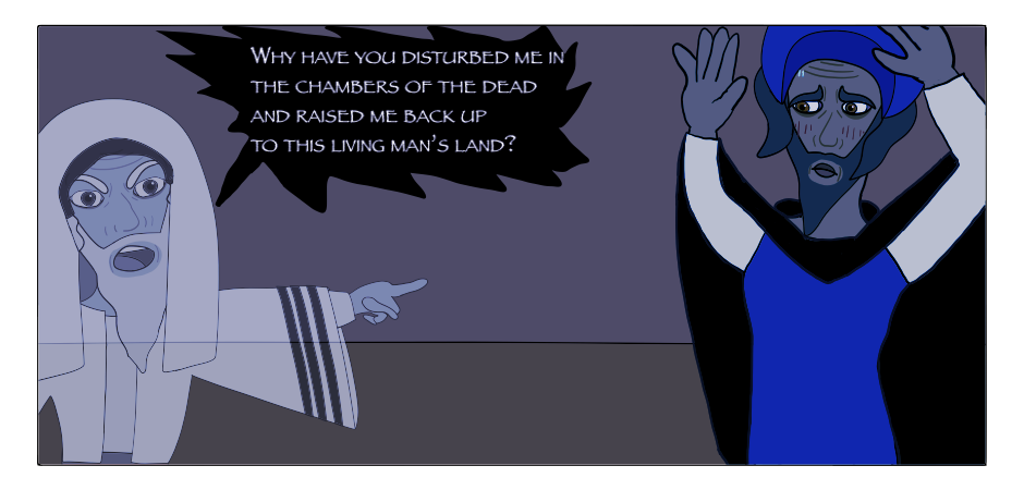 Sh'muel berates Shaul for raising him up from the dead, but Shaul has questions for him.