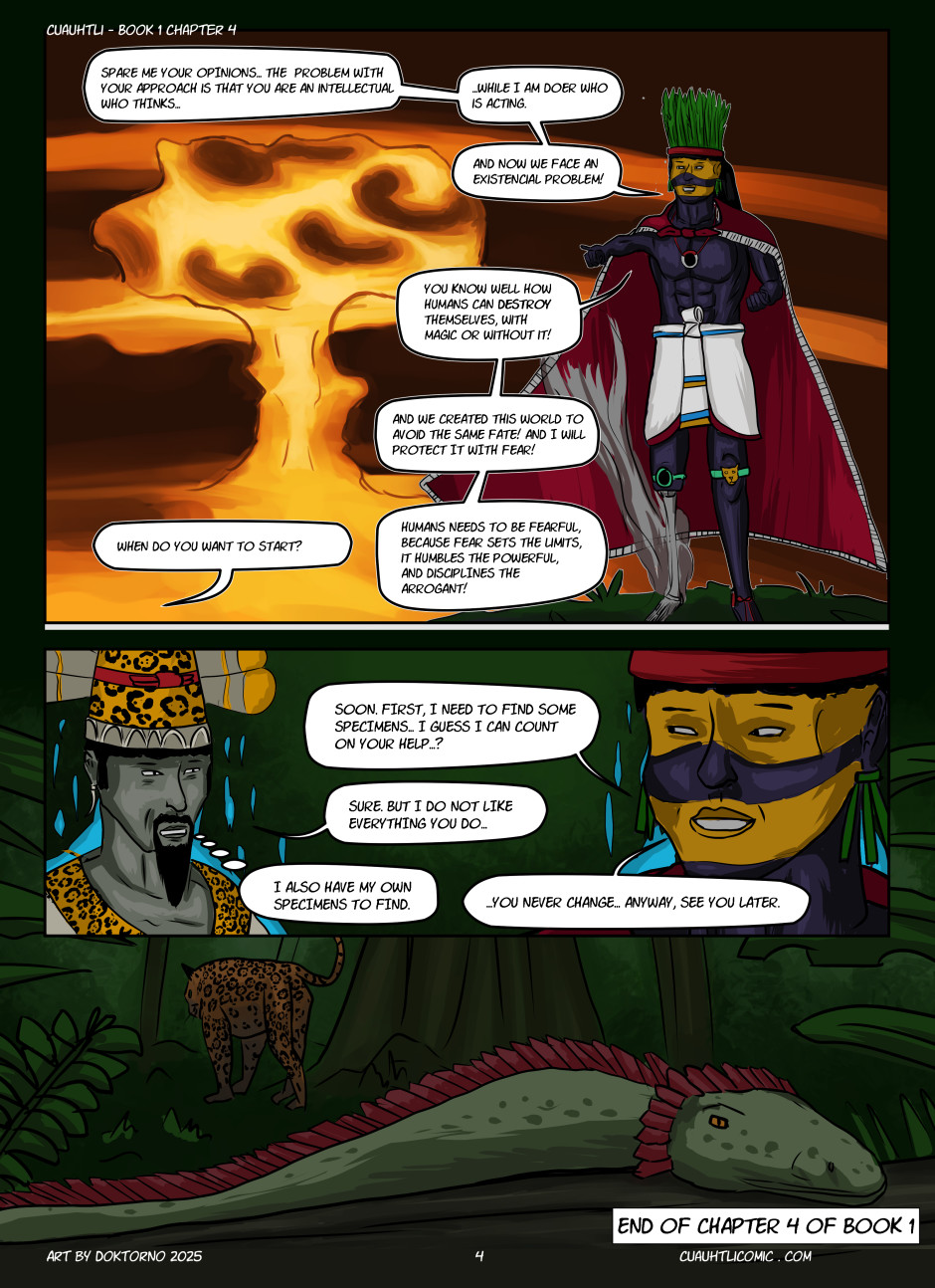 An action adventure fantasy comic about eponymous travelling mercenary warrior (whose name means “Eagle” in classic Nahuatl) in a fictional world inspired by cultures of pre-Columbian civilizations, like Aztecs (and other Nahua peoples), Maya etc. A story of both adventure and self-discovery in ever changing world. 15+ years age rating for brief nudity and violence.