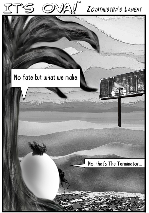 Nietzsche would never have guessed that premenopausal ovum would be a highly existential bunch, but they are. Our resident ova-philosopher, Zovathustra, is in constant contemplation about life, fate, and the occasional Terminator reference. A dose of reality and the new OvaShot 3000 make a fateful debut.