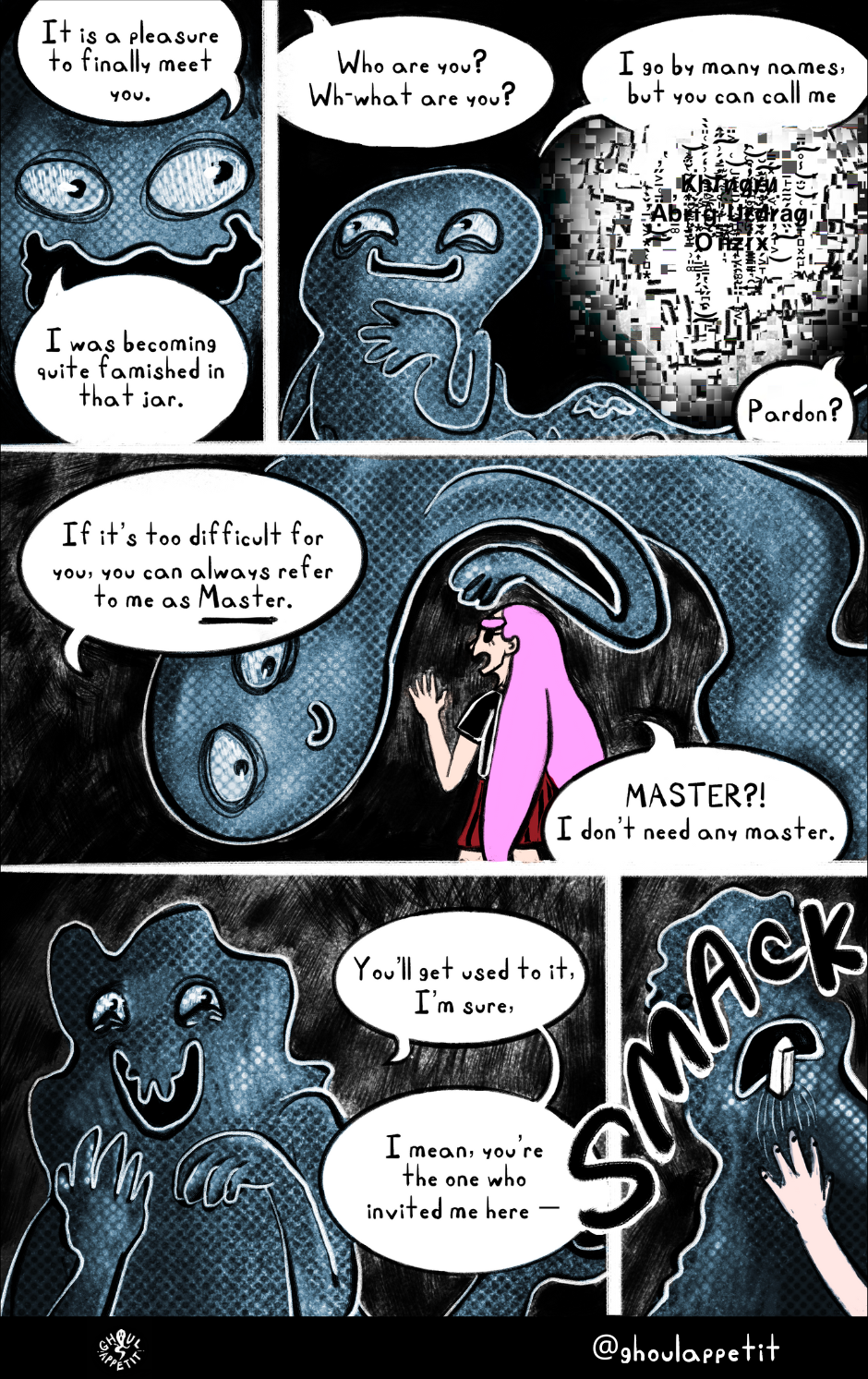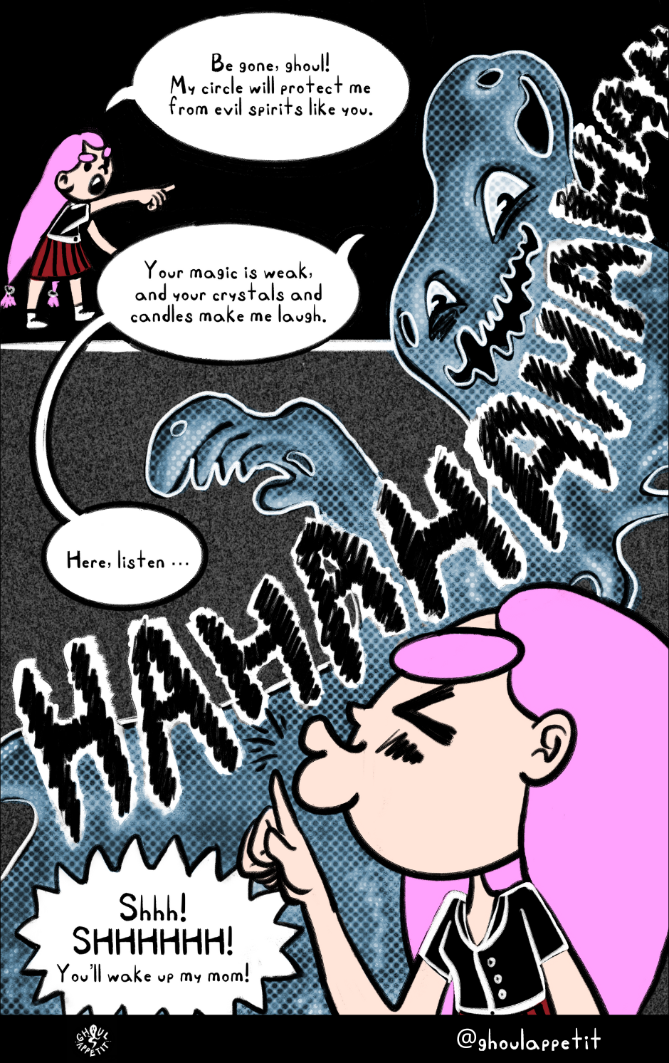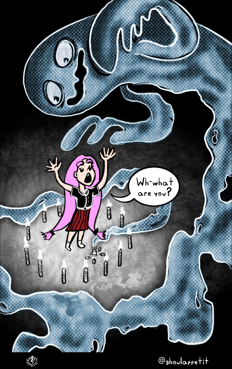 Ghoul Appétit! is a "slice of magical life" story that is an angsty, goofy, and witchy coming-of-age webcomic that seeks to reflect on how food can be a means of self-understanding and connection with others.
