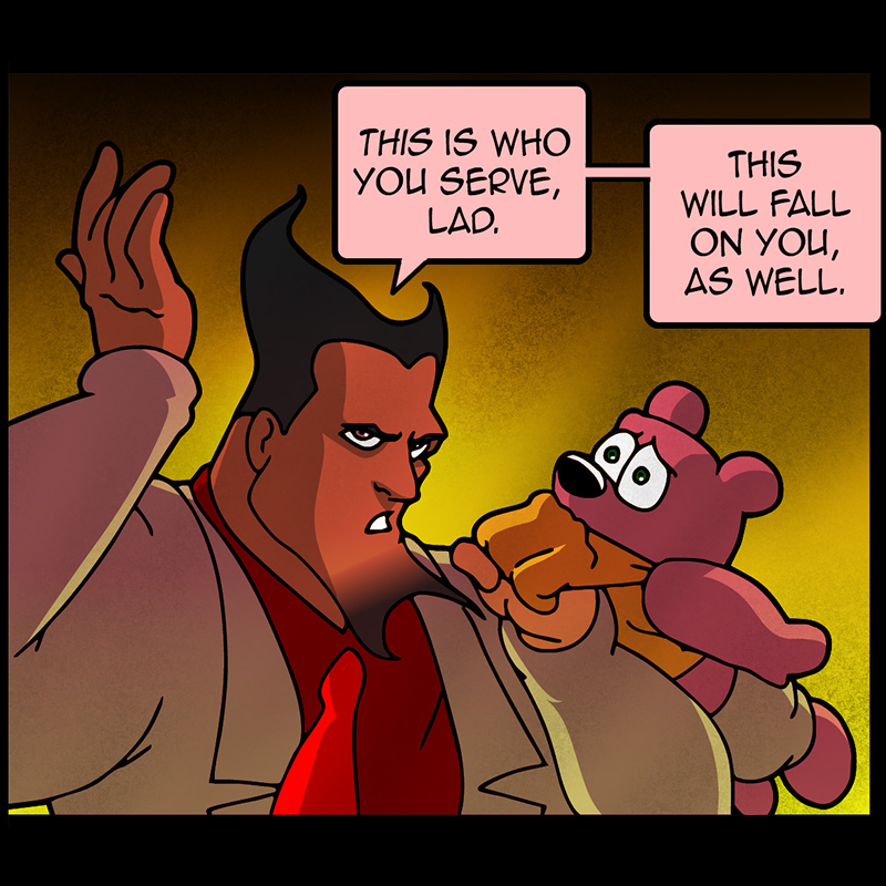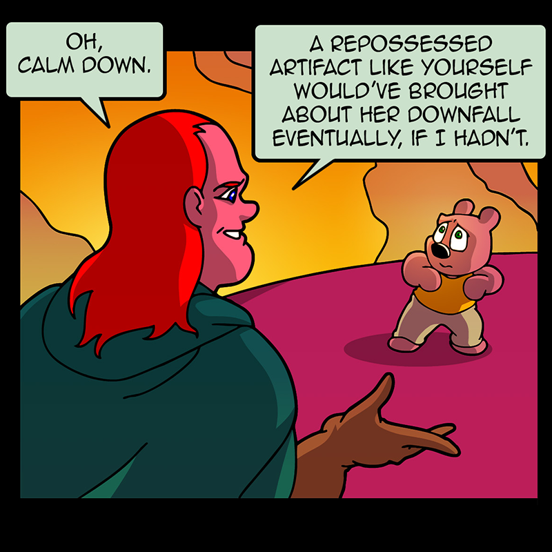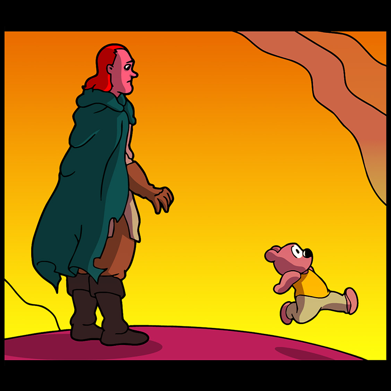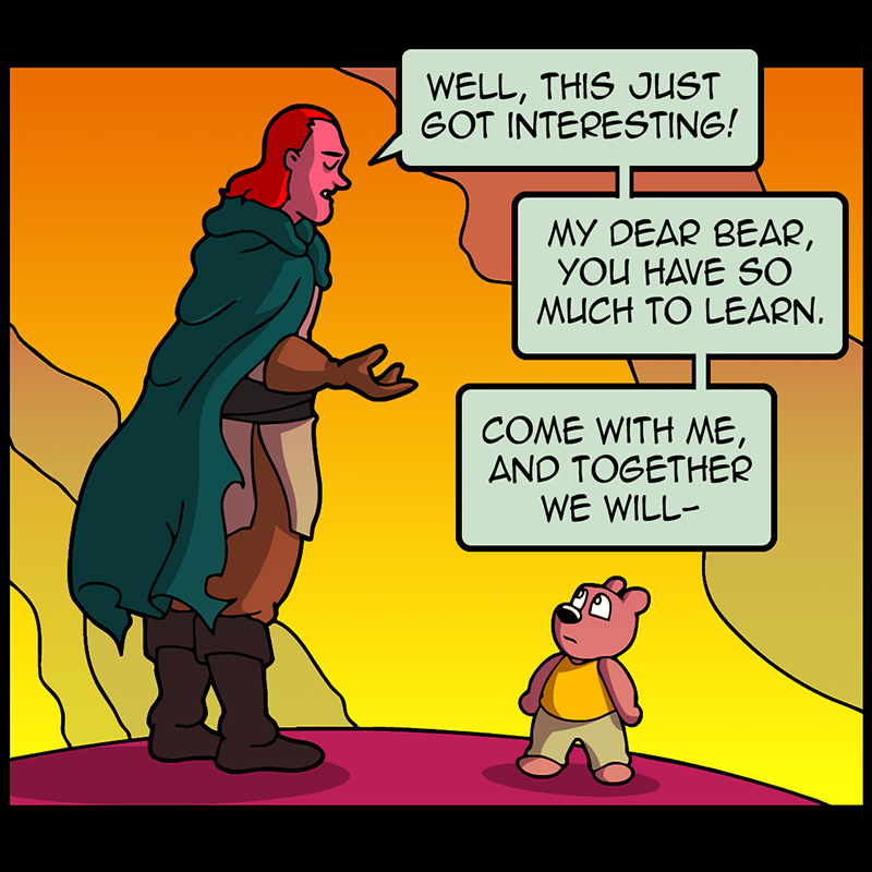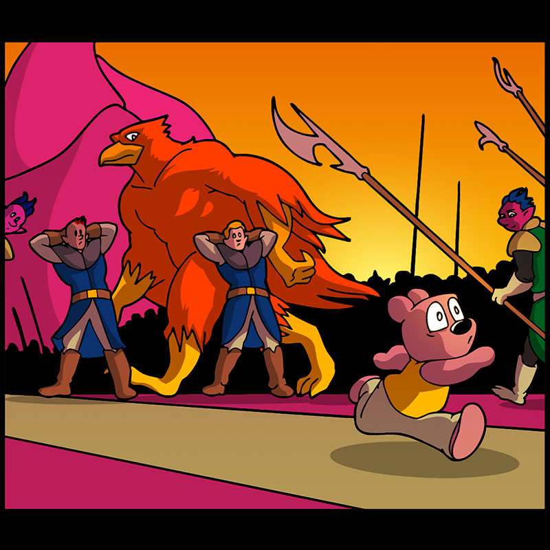 In a vast and war-torn sky realm, a desperate warlord summons a horde of powerful tree creatures, with hopes of bringing the wars to a close ( in her favor). She soon learns that said tree creatures have been accompanied by a small, do-gooder, stuffed bear ... who also happens to be the trees' translator. Hijinks ensue.