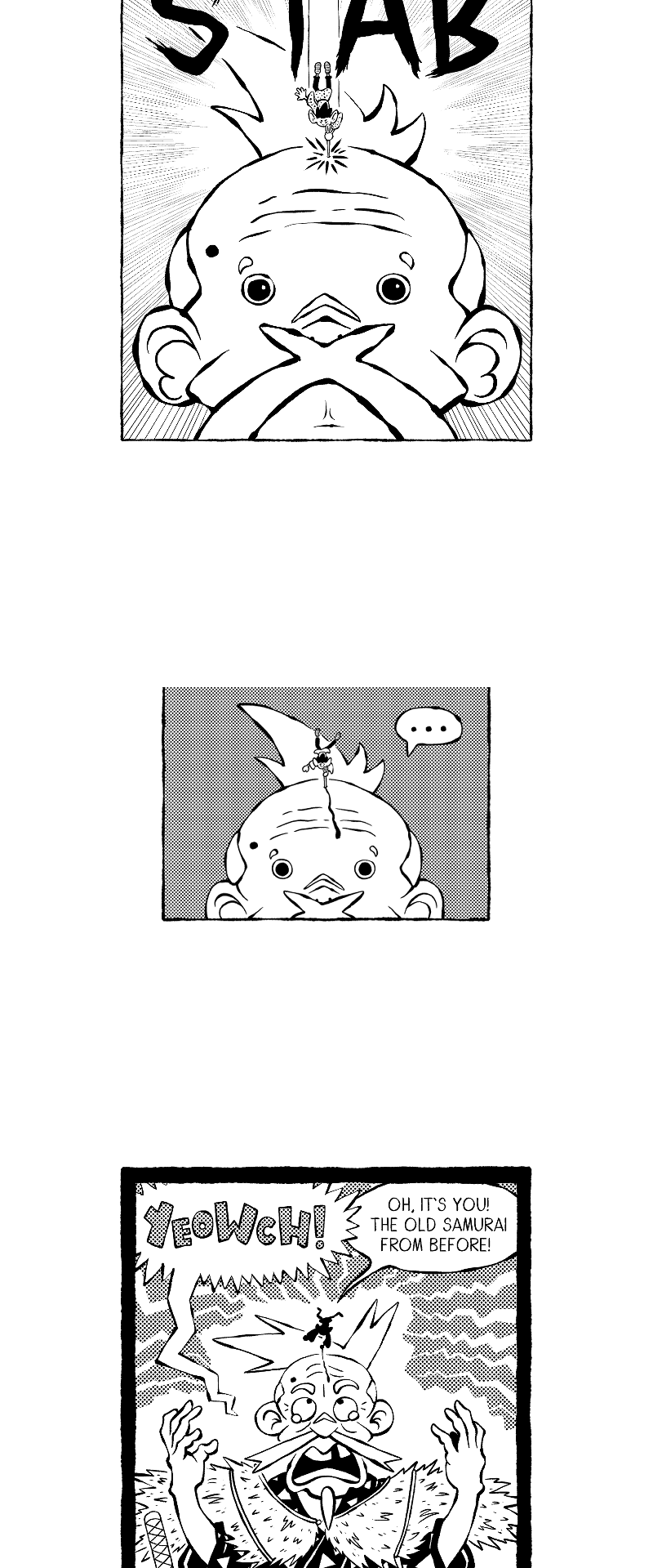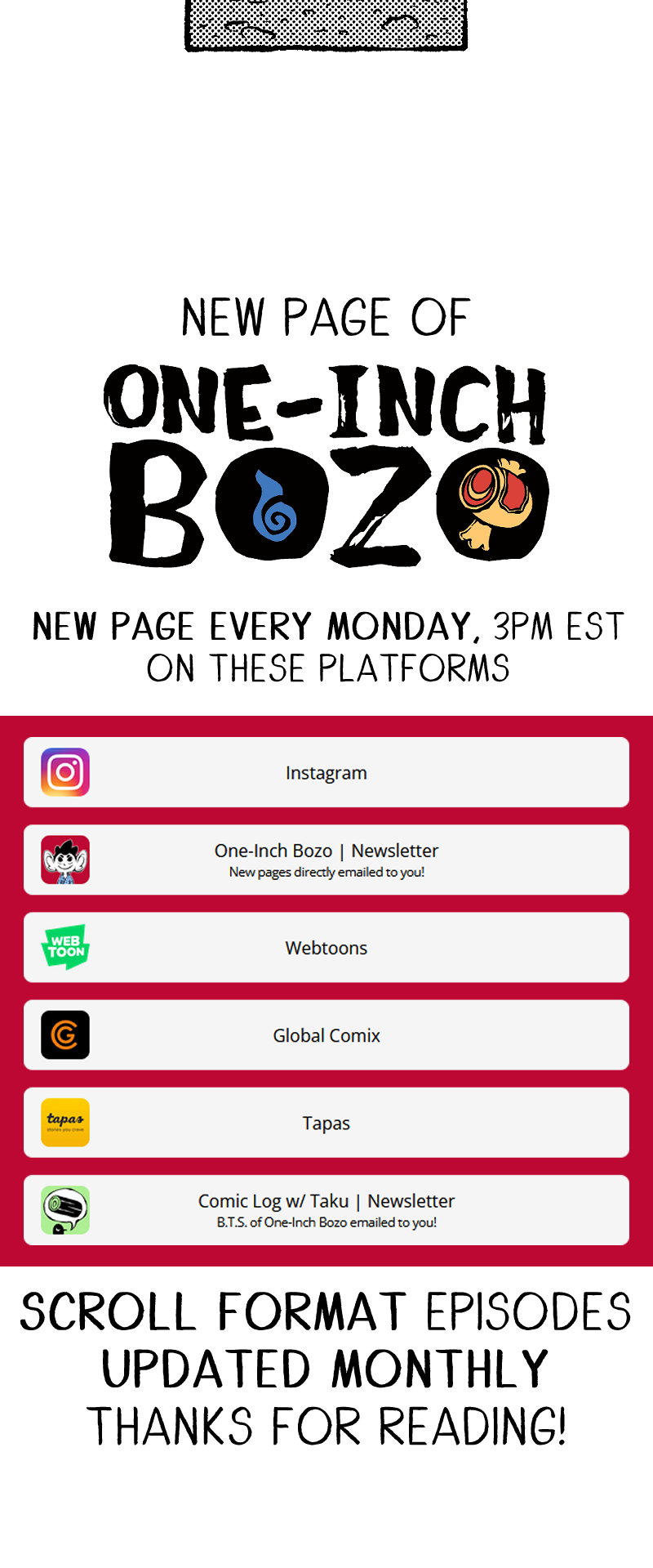 Thank you for reading One-Inch Bozo! This version of One-Inch Bozo formats 4 pages of the comic into one, scroll/mobile-friendly chapter. If you can't wait to see what happens next, check out this version of One-Inch Bozo that's updated weekly: https://www.webtoons.com/en/canvas/one-inch-bozo/list?title_no=1078260