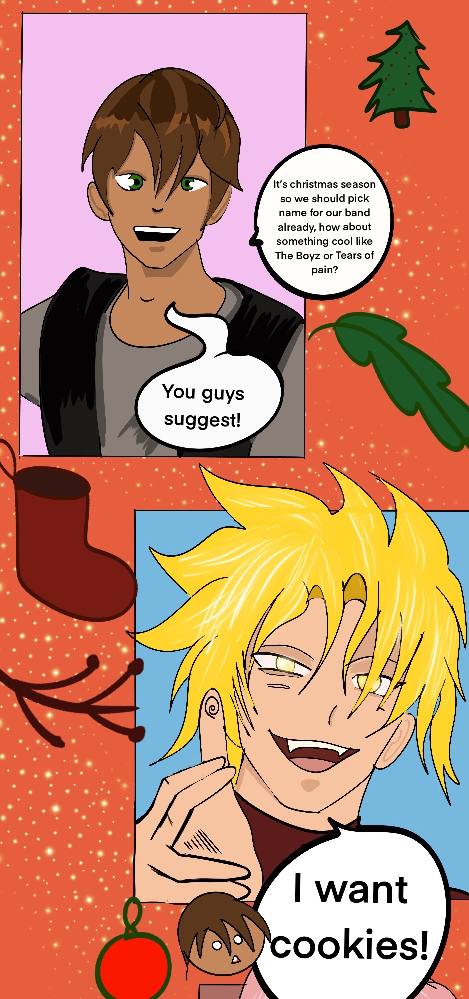 And Boy Band strikes again and this time to warm your holiday spirits! @Izzybloom91 - webcomic Infinite Strike https://tapas.io/series/Infinite-Strike/info and - Webnovel Hitchhiker https://tapas.io/series/Hitchhiker/info @crazy_lollipop01 - Life Through Hell Eyes https://tapas.io/series/Life-Through-Hells- @pompastic05 - The Gifted and the Gifted After Stories https://linktr.ee/Pompastic They drew my character named Connor in my webnovel series! @mic_mac_roni - The Fury Flame (myself) https://tapas.io/series/The-Fury-Flame