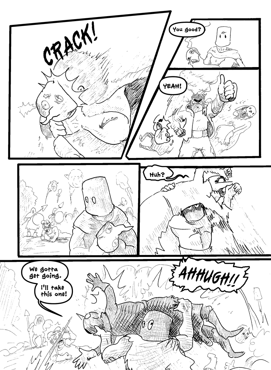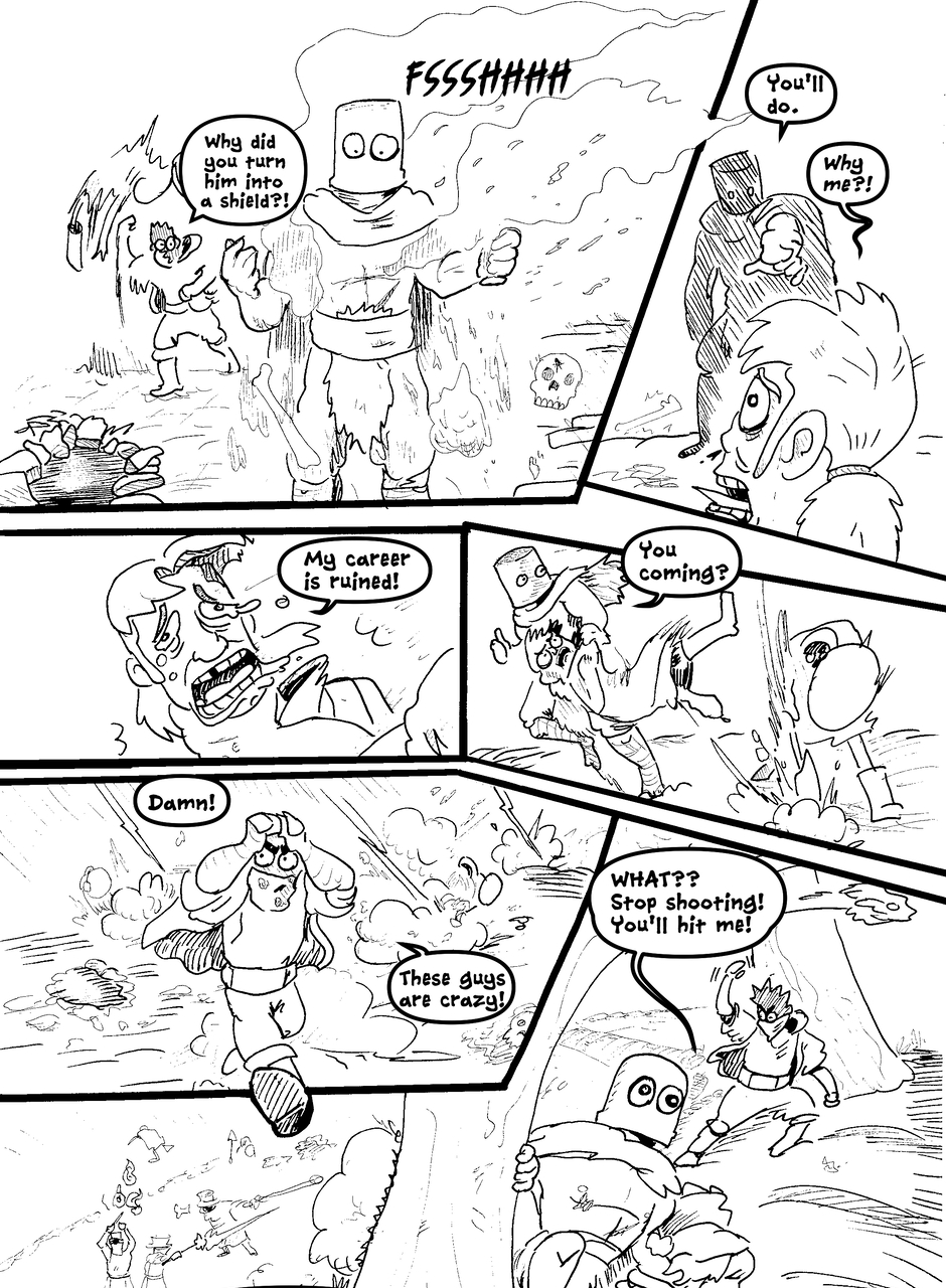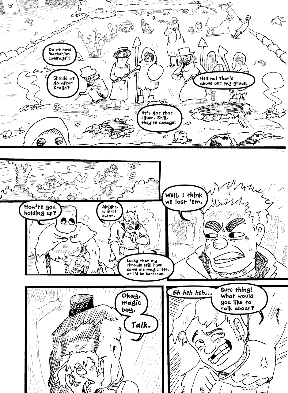 What is under the bucket? No one is sure... This Barbarian has an impossible goal. With the aid of Biff the clown brawler and Brissa the business witch, they'll help one another achieve their goals. The road won't be easy in a world full of barbarians, monsters and Reptothrax's Mighty Draconian Legion.
