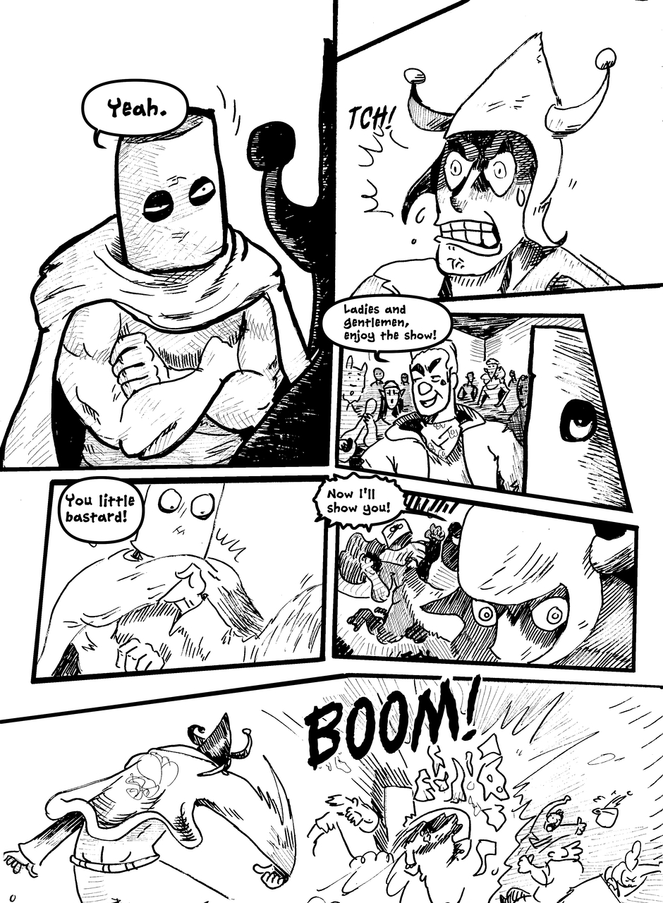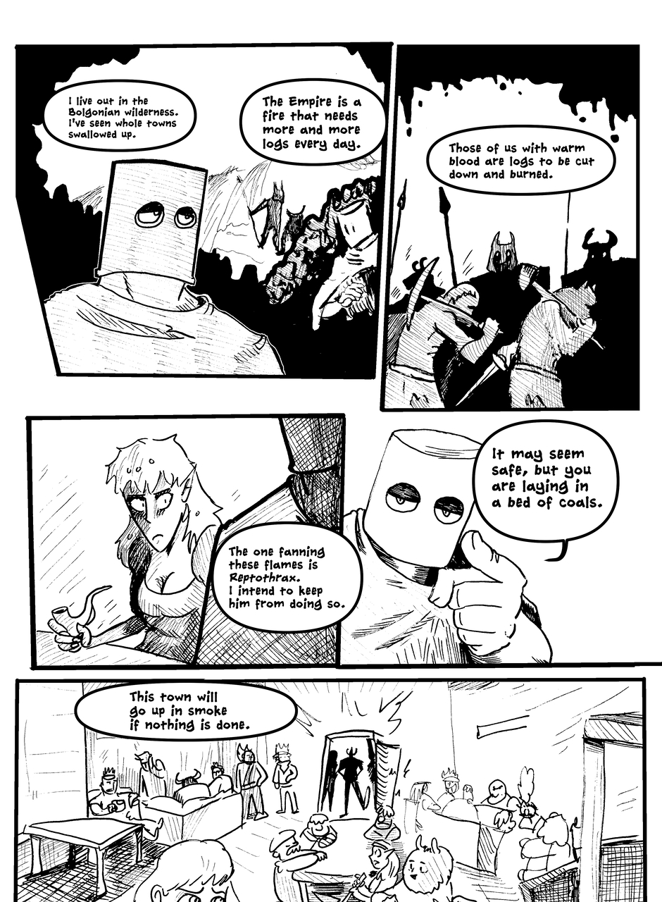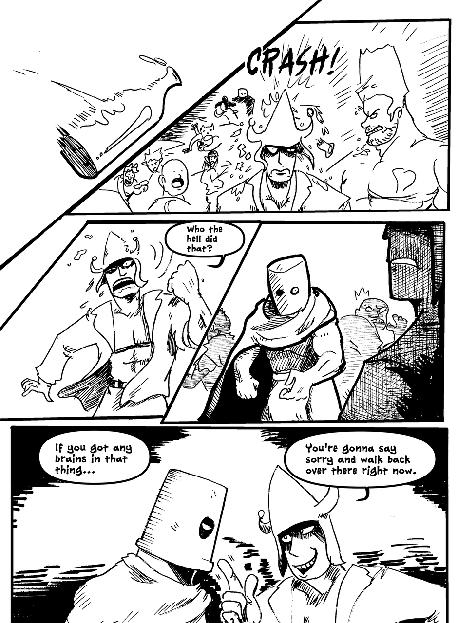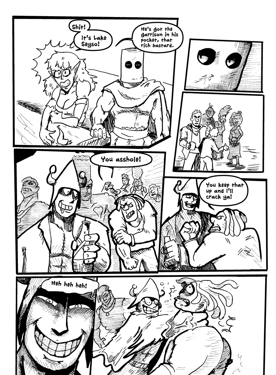 What is under the bucket? No one is sure... This Barbarian has an impossible goal. With the aid of Biff the clown brawler and Brissa the business witch, they'll help one another achieve their goals. The road won't be easy in a world full of barbarians, monsters and Reptothrax's Mighty Draconian Legion.