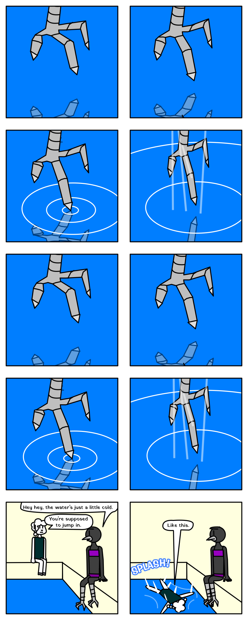As we can see in this here comic, Adjana attempts to inter a body of water, but is unable to on account of it's harsh, freezing temperature. According to Wikipedia, the free encyclopedia, water covers 70% of the Earth's surface, and drinking it is required for all living orgasms to live. Mover Nature, in here eternal wisdom, dicided to turn into a bovine, and let us little calfs suck on her big, watery teats, like the calfs we are, the sweet, teasty calfs that would sure go good on a burger.