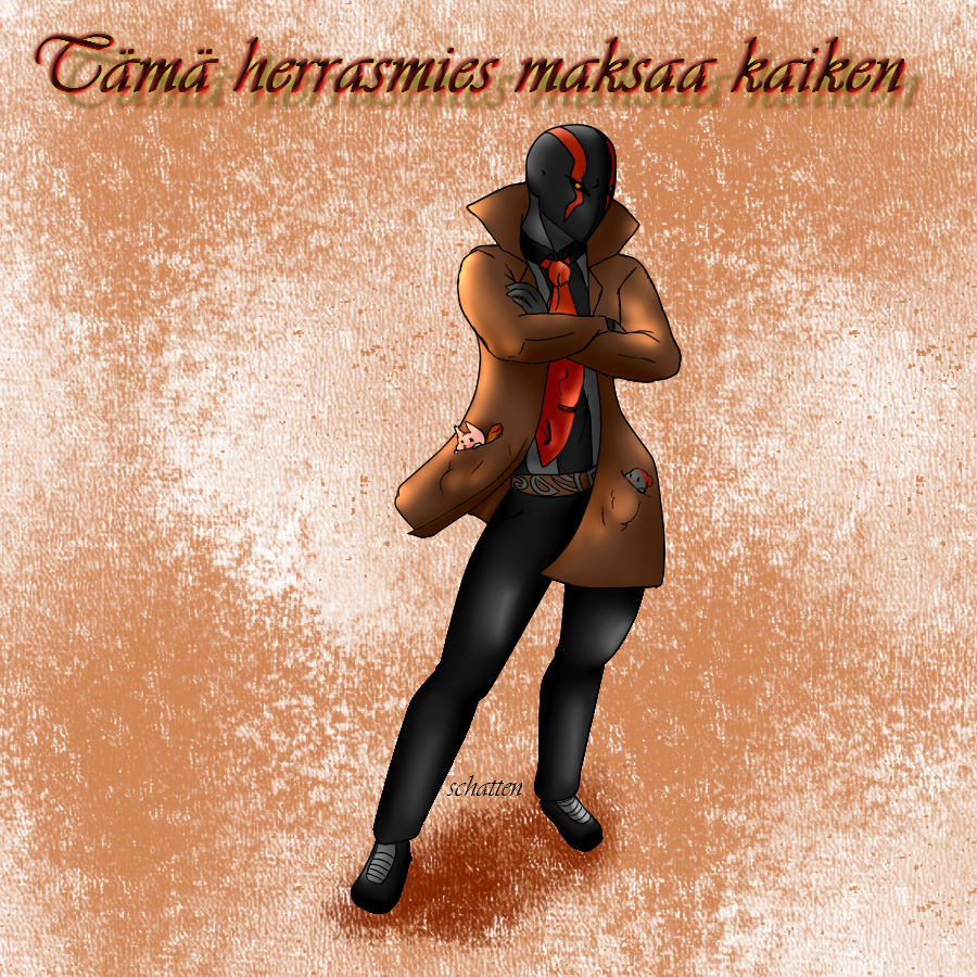 "Tämä herrasmies maksaa kaiken" is our new Finnish word for today x3 it consists of two parts, part one "Tämä herrasmies " meaning " this Gentleman" and "maksaa kaiken" which means " will pay for everything" ... you can use it to get a girl's heart if you want, just make sure the girl won't give you a high five on your cheeks later xD ... Restoria, here is your fan-art ;3 sorry for being late ^w^ and sorry, nothing fancy this time =3= ... the background music is a Russian lullaby x3 ... for those who wanna get creeped out by the lyrics, here is the link for it >:3 https://www.youtube.com/watch?v=BDMmj5WgB8c ... and if you still wonder who Restoria is, here, check him out x3 https://tapastic.com/angelojose0930 yosh! hope you learnt something new ... until next time .. take care guys=w=)7