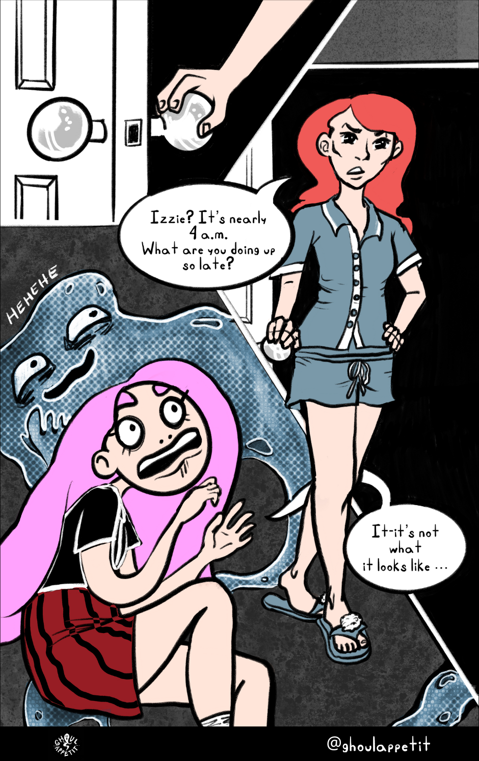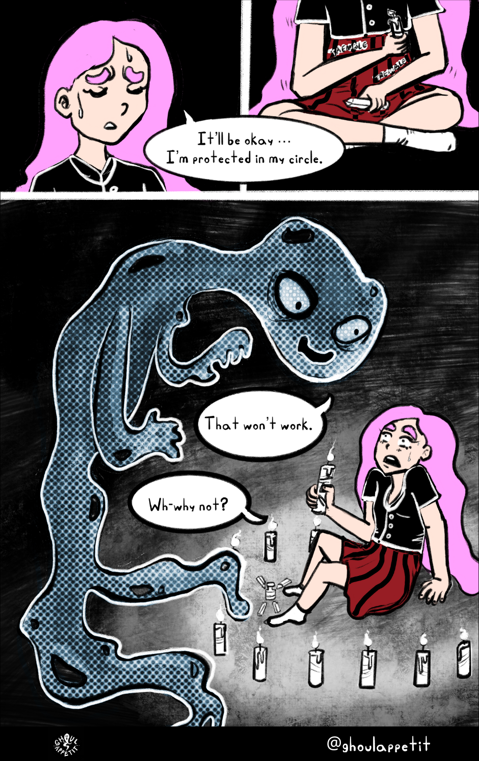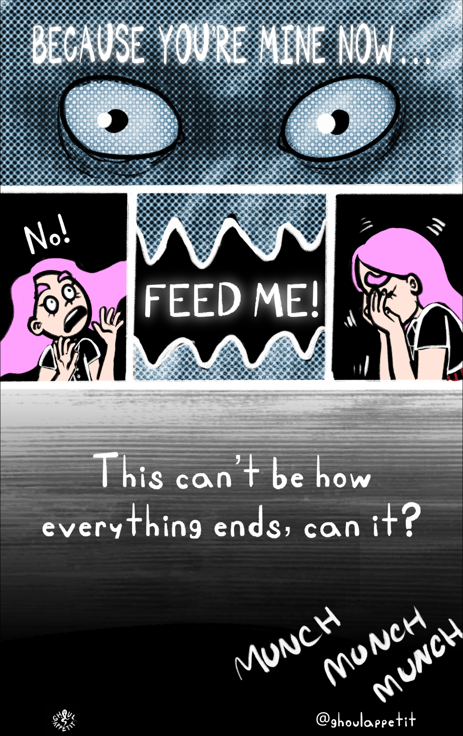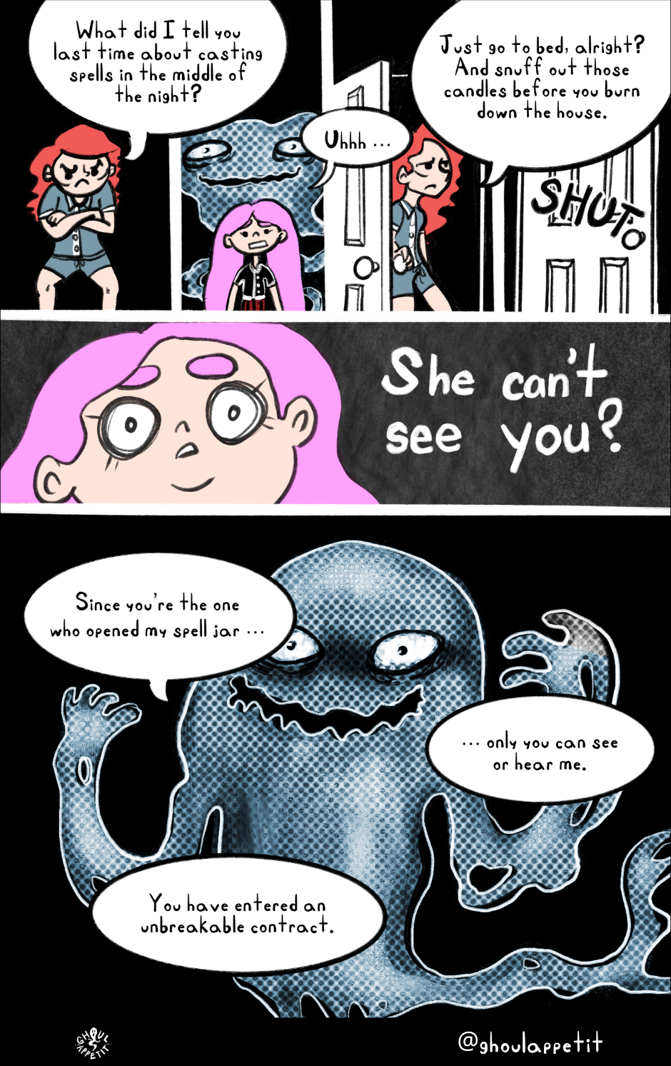 Ghoul Appétit! is a "slice of magical life" story that is an angsty, goofy, and witchy coming-of-age webcomic that seeks to reflect on how food can be a means of self-understanding and connection with others.