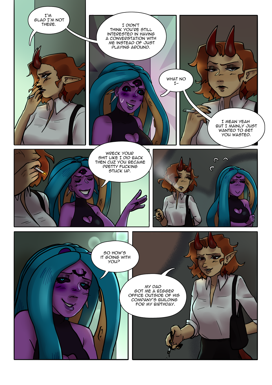 In a modern world filled with curses, Tenta, the unemployed octopi girl and Anti, the half-demon lawyer reunite after their relationship abruptly ended in their teenage years. Now as adults they find that nothing between them has changed, except that the drama and mystery surrounding their relationship only grew. Such misfortunes may include: a love triangle, family issues, defending your crush's toxic ex in a murder trial, getting stalked by an anonymous casino CEO, inheriting curses, descending from curses, evil women, clowns, and other common occurrences in a lesbian love drama. In a story where character growth is less about changing, and is more about learning to want to make a change, follow the two main characters as they overcome their unhealthy self images and defense mechanisms not just for each other, but eventually themselves. Her White Lies is a comic about about the fear and denial of facing the painful truth.