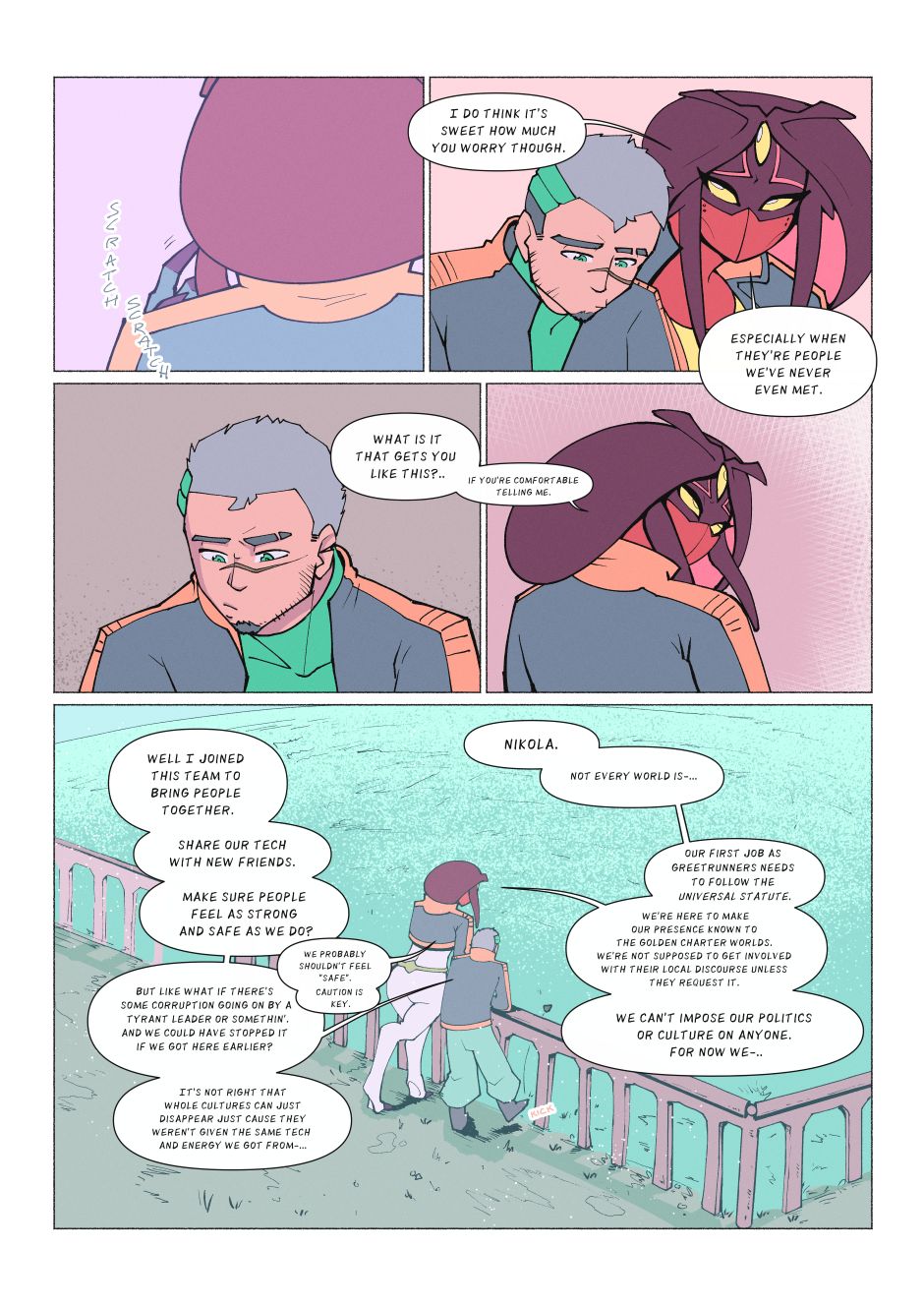 Responsible for making first contact with new alien species, the Greetrunners work to unite the universe with bonds of trust, understanding and empathy. Adventuring across the stars while forming friendships, relationships and romance, they bring more and more people into the fold of the mysterious Precipice Project. However with so many different walks of life and so much history yet unknown, trust may not easily be gained or returned in kind.