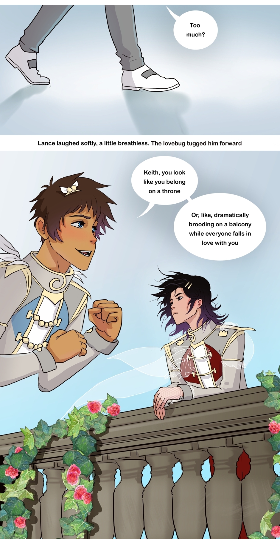 A Klance Love bug au comic featuring Keith/Lance pairing from Voltron! Keith and Lance are on a brief mission on an alien planet collecting supplies when suddenly Lance gets bitten by a love bug, causing him to absolutely torture Keith with affection. Keith is sure this is how he dies. Both boys are pining idiots. Enjoy!