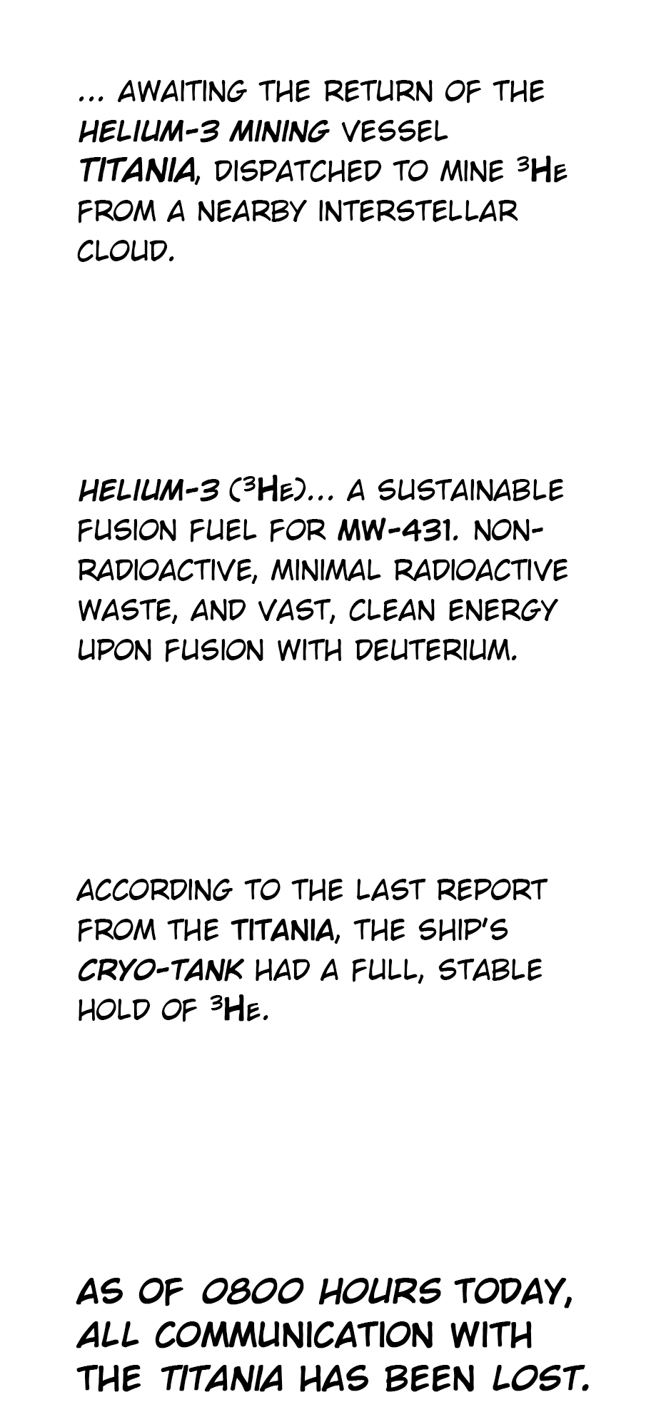 While extracting Helium-3 from an interstellar cloud, the mining vessel "Titania" finds all communications cut off before stumbling on an incoming transmission from a nearby planet.