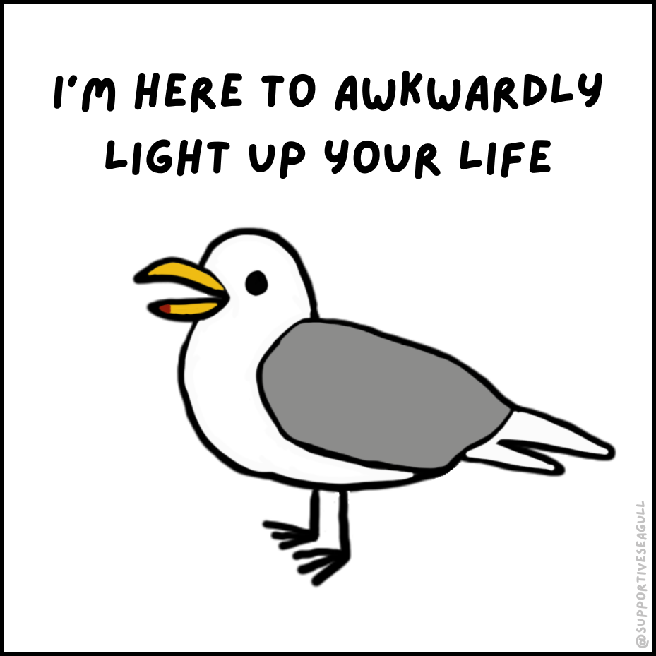 Supportive Seagull is a comic about a silly little seagull who is aggressively supportive, doesn’t sugarcoat reality, and goes on little adventures to make new friends. Sometimes motivation sounds less like an inspirational TikTok and more like a seagull screaming support in your face.