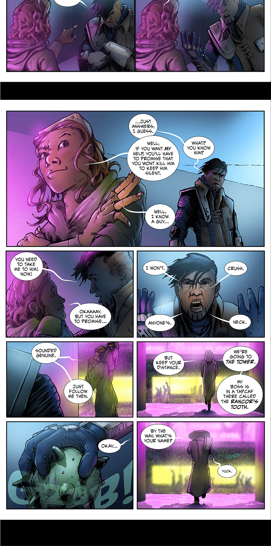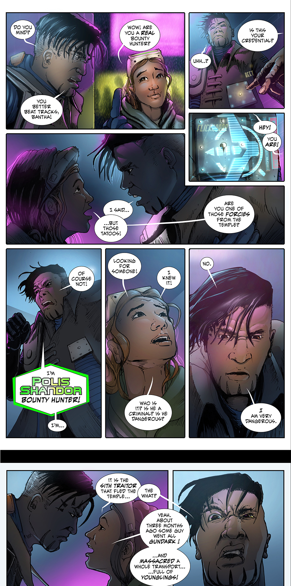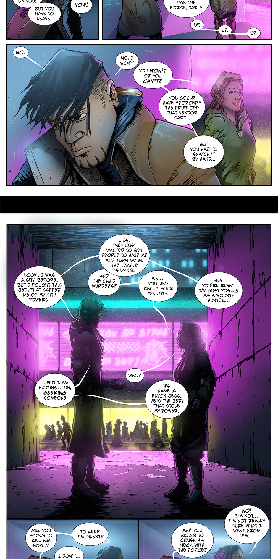 Taris feels a strange sense of relief, not that his mission is finally moving on, but but that he just confided in someone. Talking to Meega seemed to take a massive burden off of his shoulders. Hearing some of those words escape from his lips was cathartic for him. What was he really hoping to gain from confronting the Jedi master? What if he grants him his power back... then what? What if Meega and her contact are just bounty hunters themselves? Is he following this new friend into a trap? I guess there's only one way to find out.