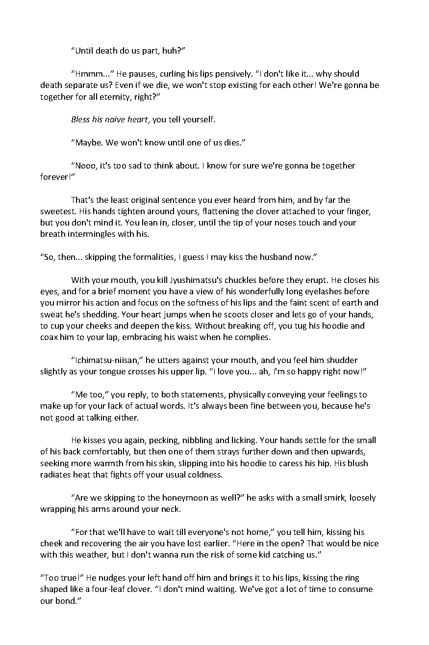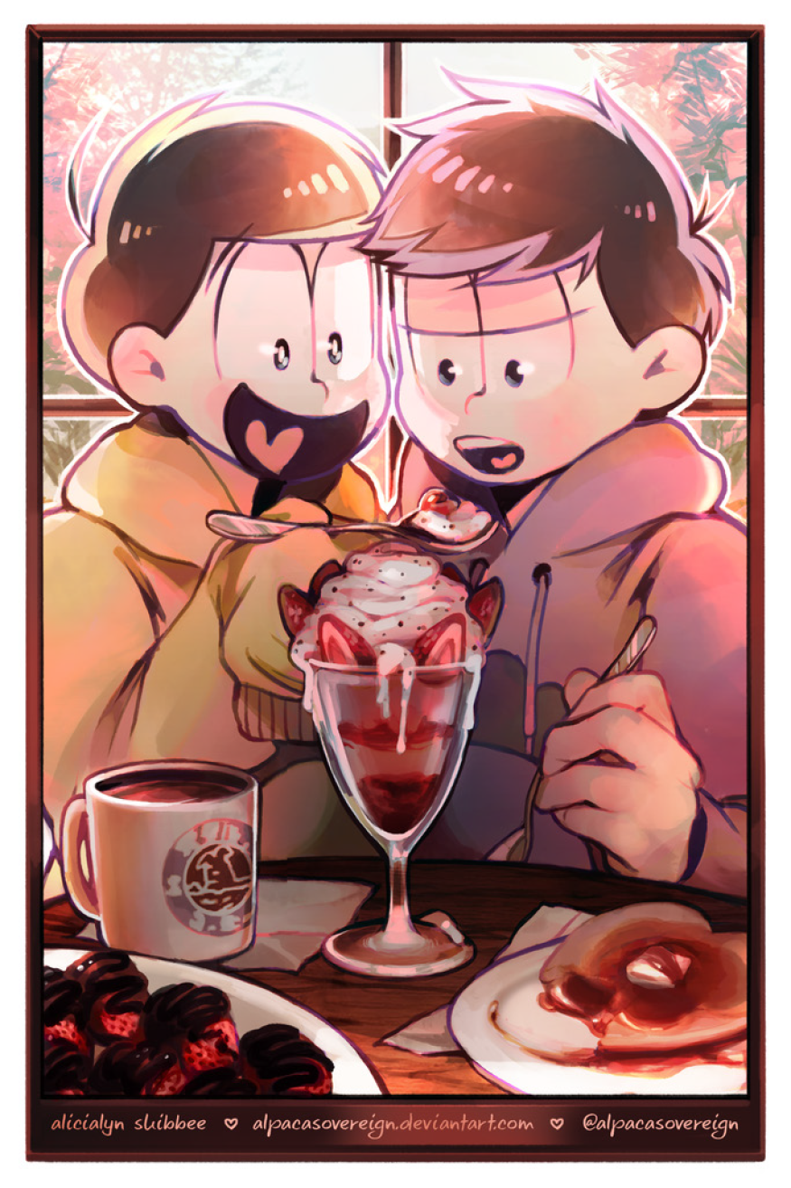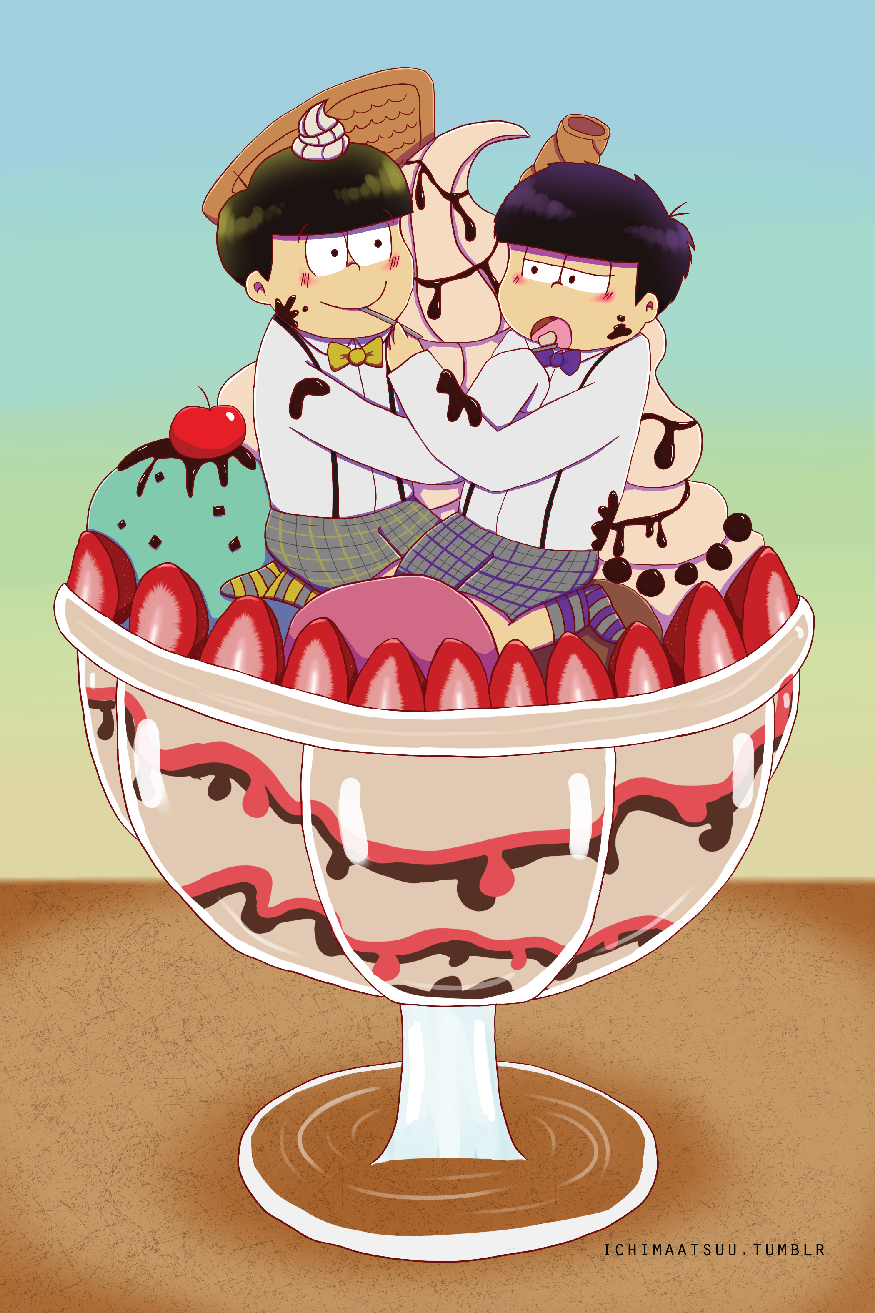 Suuji Sundae is a fanzine comprised of the work of over 70 different artists and authors, to create a book filled with artwork of the Osomatsu-san pairing, Ichimatsu x Jyushimatsu. To download both the sweet and spicy sides of the zine, head on over here: https://k1ttensocks.itch.io/suuji-sundae