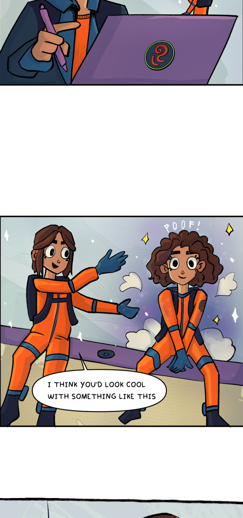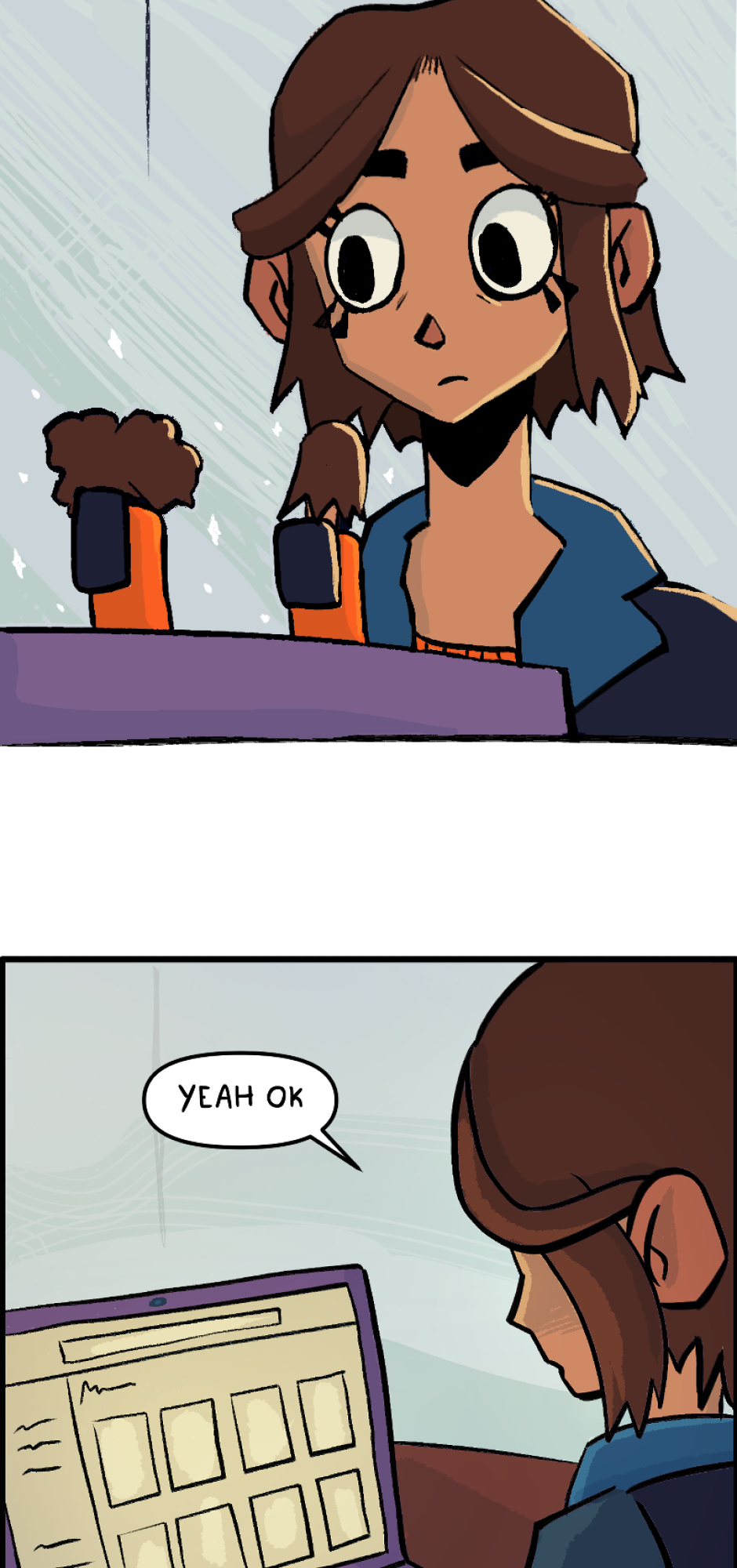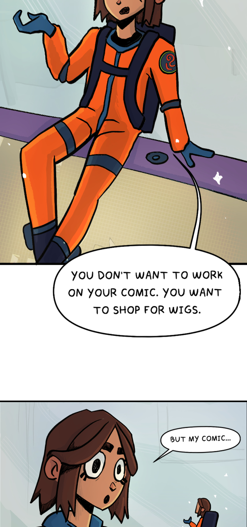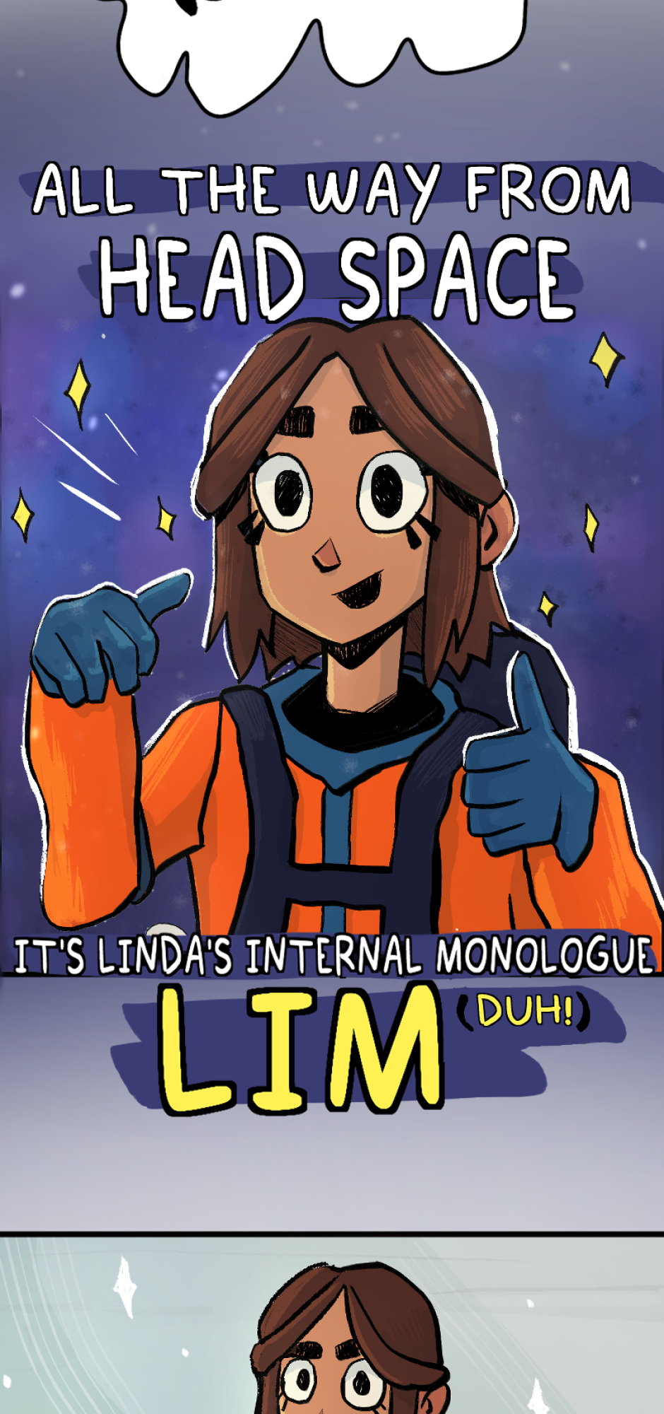 3rd Episode! A fun fact is that this is actually the 1st episode I managed to finish drawing completely. Ultimately I decided to place it 3rd, though. Here we meet Linda's internal monologue. She's a floaty little astronaut of an individual. Like a shoulder angel with the inhibition of a 3 year old.