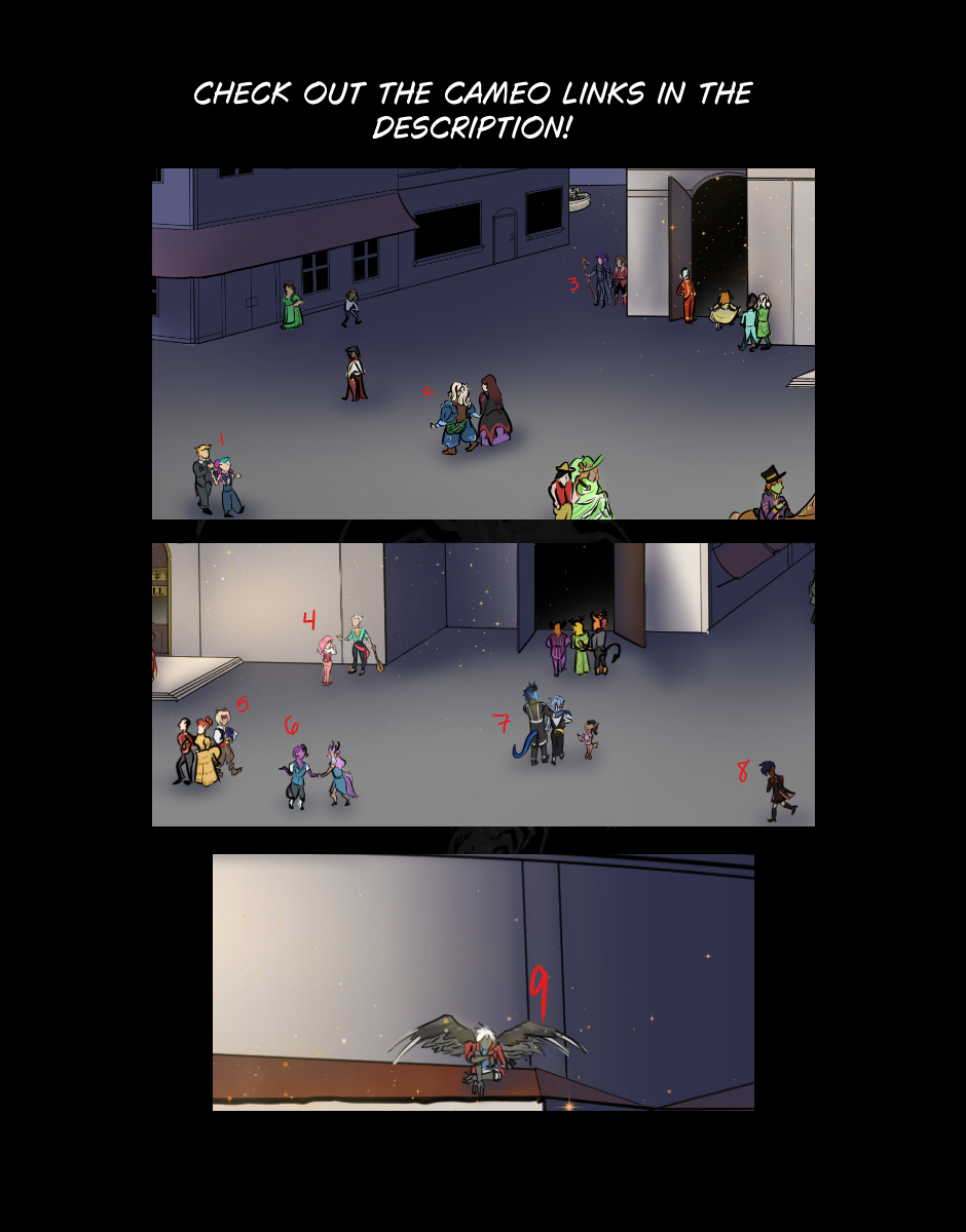 Solutions to the 9/10 "Where's Waldo" cameos in this week's page are below! Please check out all these lovely people and their OCs/comics!