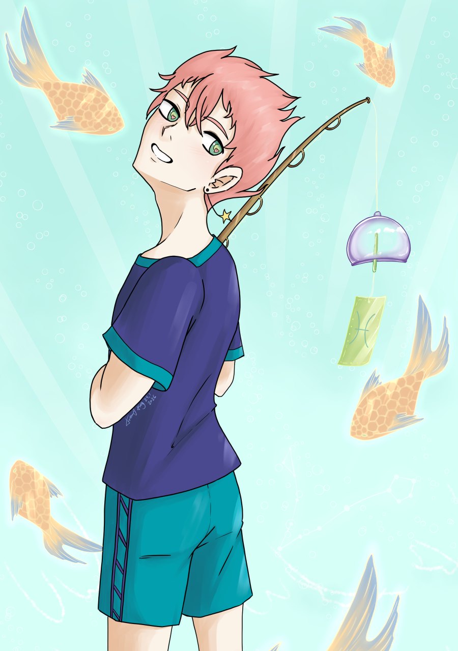 anyway hehe funny story; i was about to skip pisces art for this chapter cuz i wasnt inspired & before posting the chapter that was done few days ago, i saw an old portrait doodle i did of him & was like " oh yeah i know what im gonna do" <i knew for months i wanted to do a fish theme for him cuz fujin from genshin gave me the idea> so i copy pasta the doodle, added legs, rod, chime & fishes, line & colors.