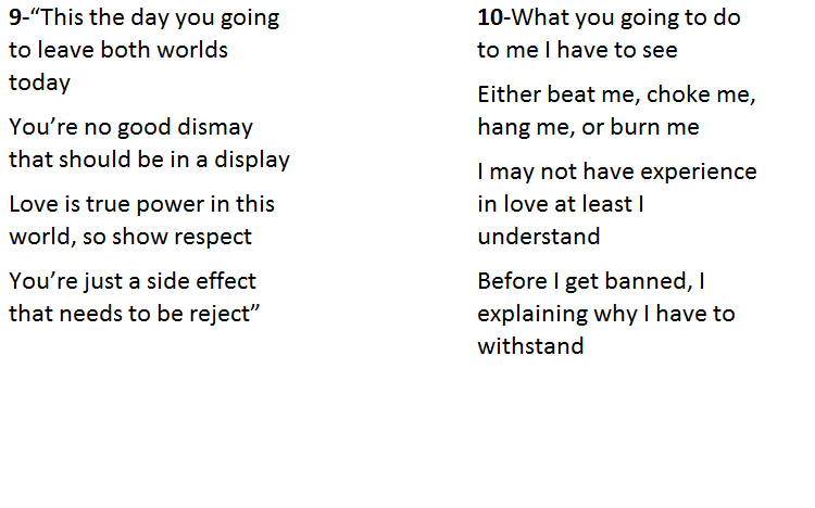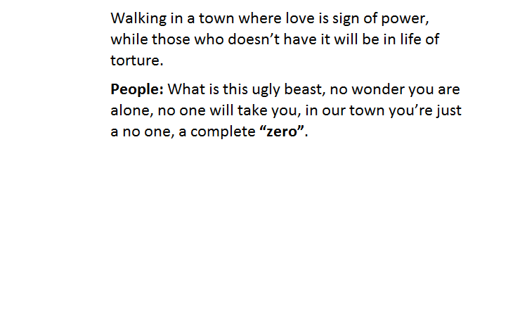 People: What is this ugly beast, no wonder you are alone, no one will take you, in our town you’re just a no one, a complete “zero”.
