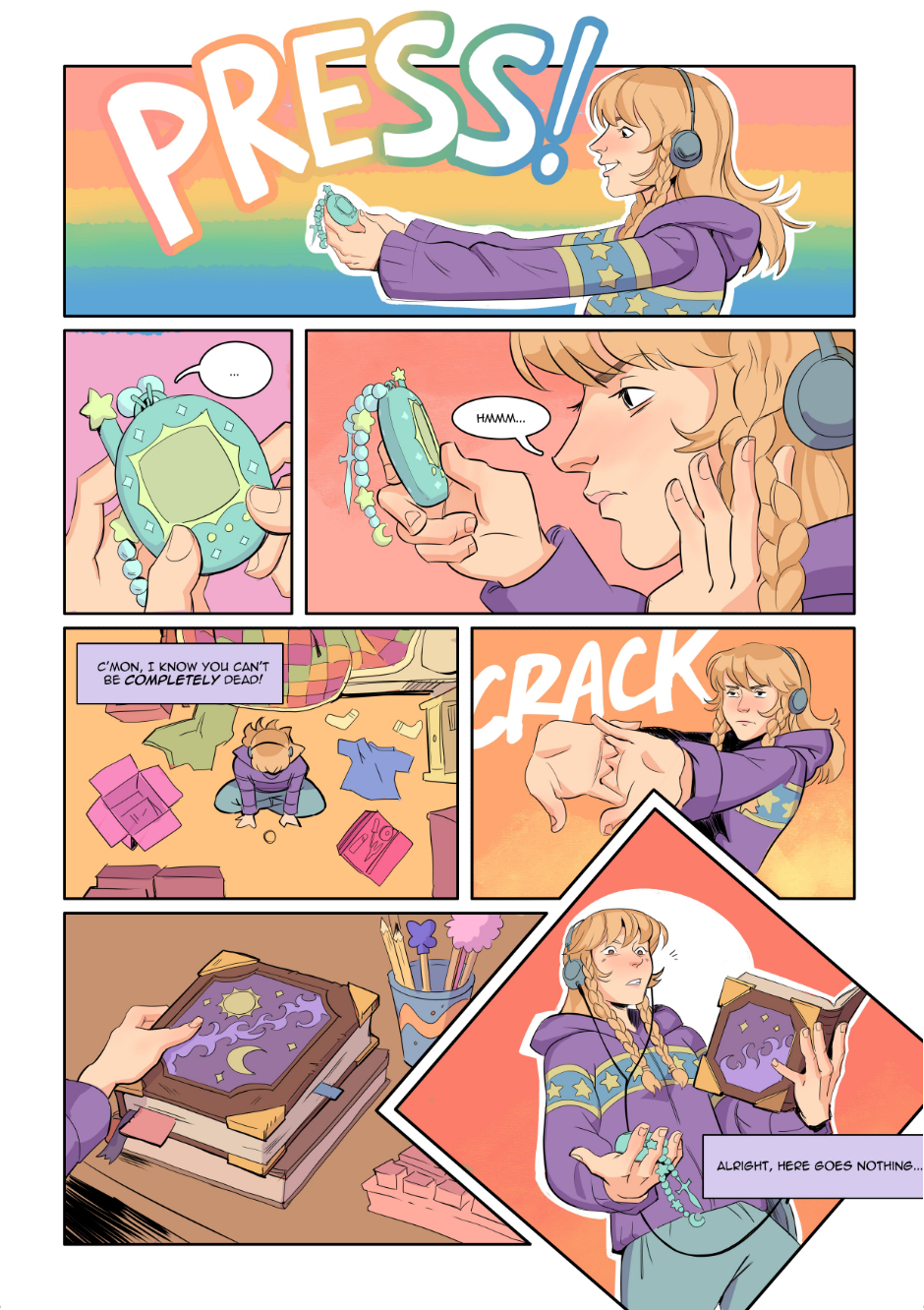 A tale of a tired witch, Fiona, who accidentally traps her boyfriend, Paolo, in a digital pet. Set in a Y2K drenched fantasy world, Fiona travels across her town, and her mind, to find the key to releasing her love from the chains of her childhood companion.