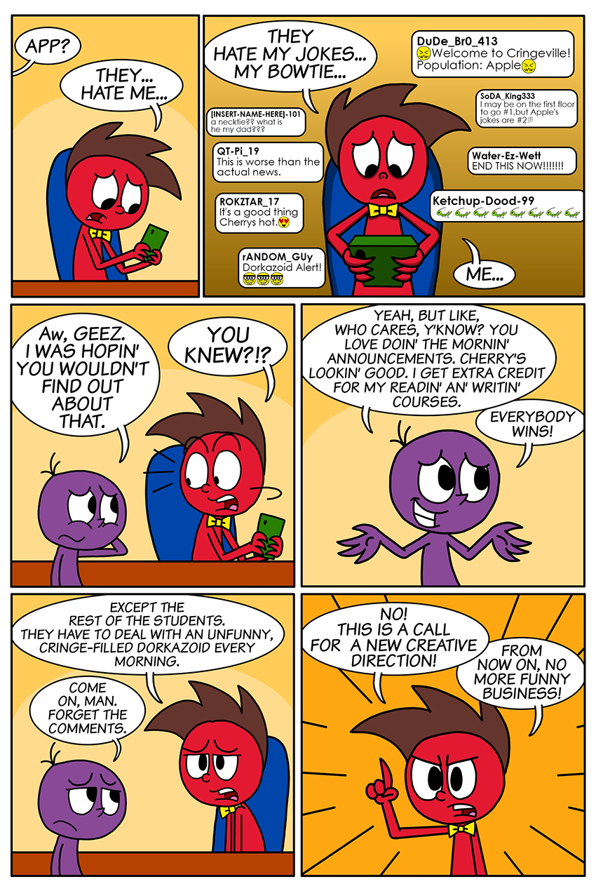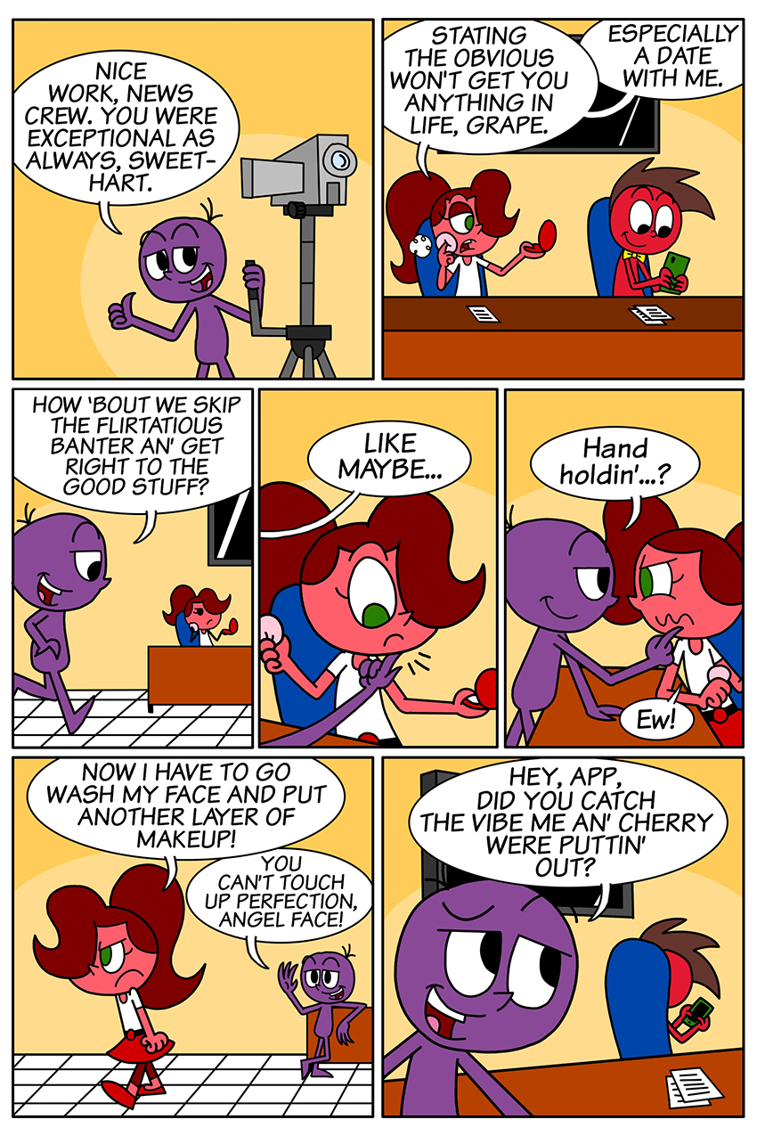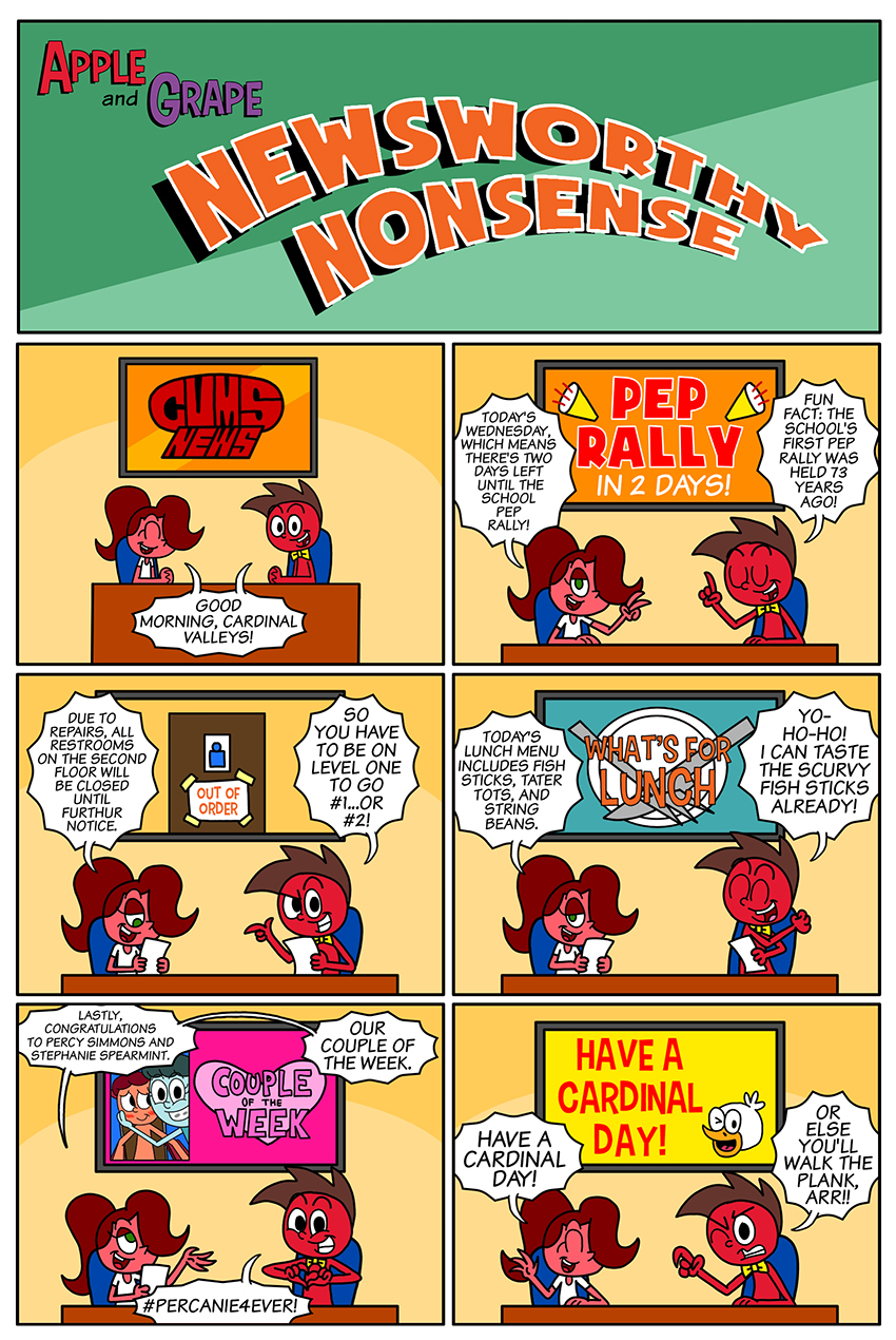 Apple tries different ways to win the audience's admiration in the school's news broadcast. Follow and purchase! Instagram www.instagram.com/apple.and.grape Lulu Press https://www.lulu.com/search?keyword=apple+and+grape&page=1&pageSize=10&adult_audience_rating=00 Redbubble www.redbubble.com/people/chazs-stuff/shop?artistUserName=chazs-stuff&collections=2501616&iaCode=all-departments&sortOrder=relevant