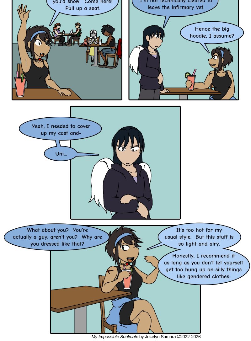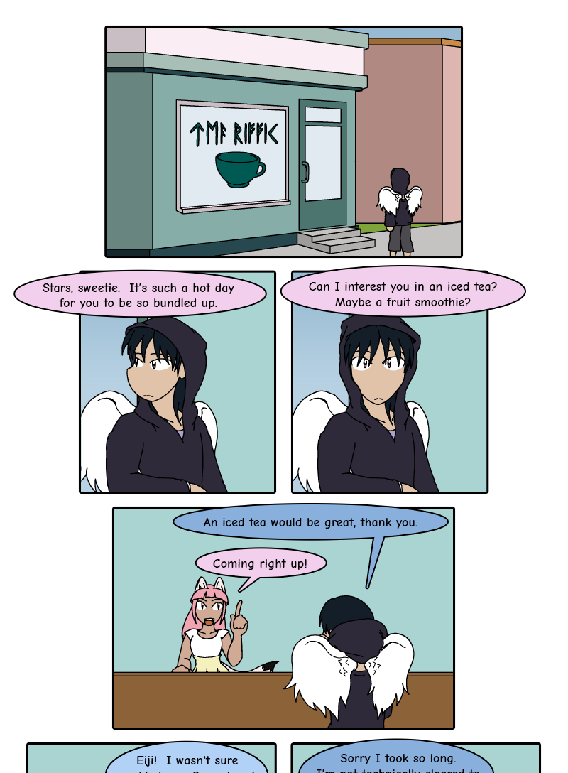 It looks like Eiji snuck out of the infirmary to meet with the thieves again (although on much calmer terms, this time). It's apparently quite hot out today, but he's thrown on a big hoodie to hide his cast. Still, it's not like it hides his wings (and as we haven't seen a lot of skyfolk yet, I'd wager those are probably the bigger giveaway for his identity). I freely admit that this was mostly for me, so I wouldn't have to write all the cast signatures throughout the whole chapter. XD