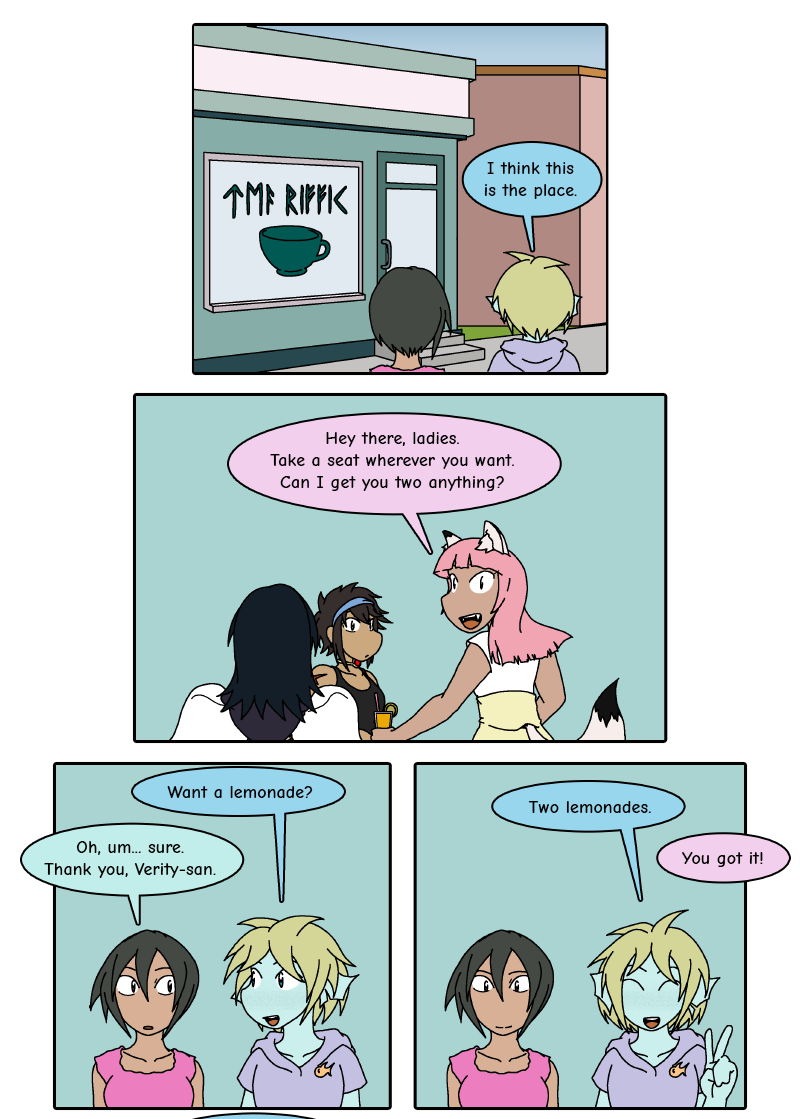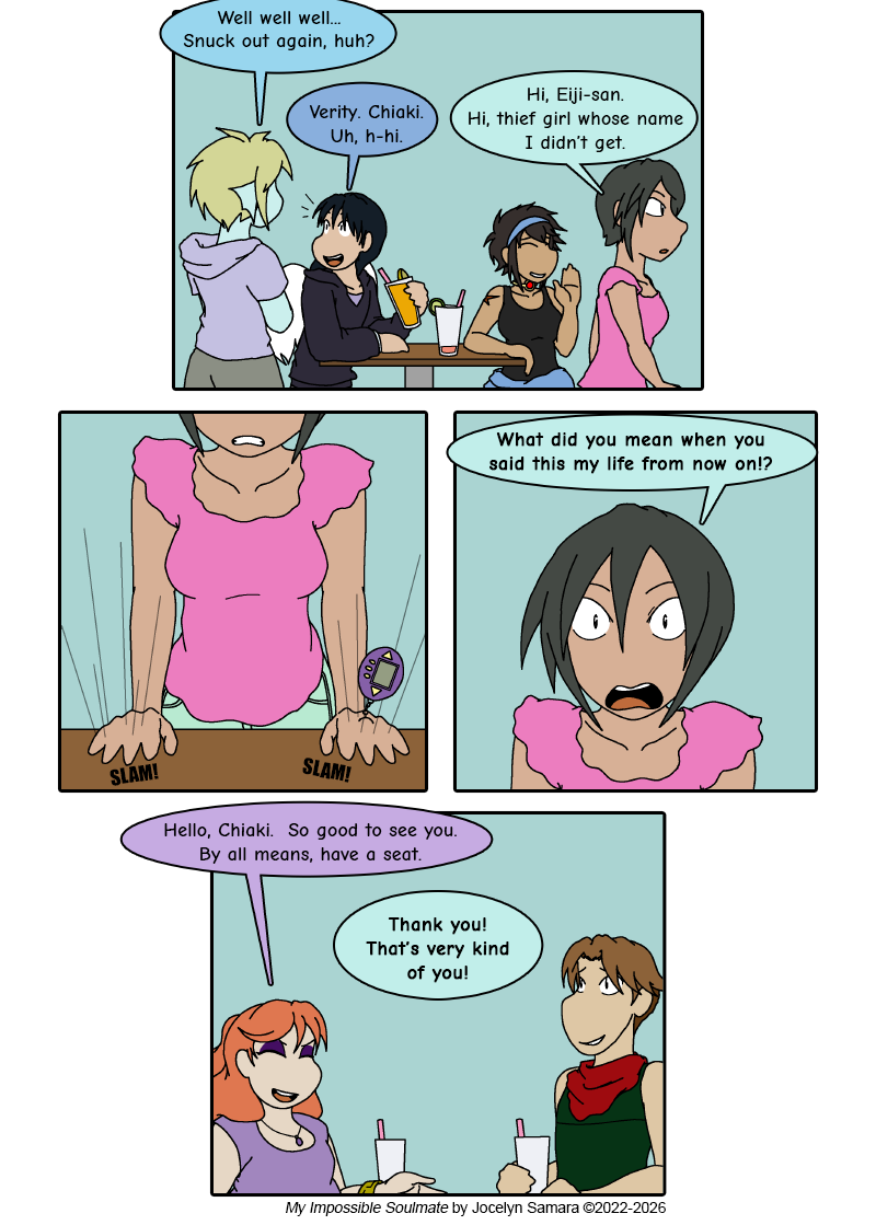 Chiaki and Verity arrive at the cafe. While Verity gets sidetracked with ordering and taking note of Eiji, there's only one thing on Chiaki's mind right now. (Don't be too upset at her for misgendering Jude, by the way. I don't think they've even properly met or interacted with each other, so Chiaki certainly does not know the situation here.) :P