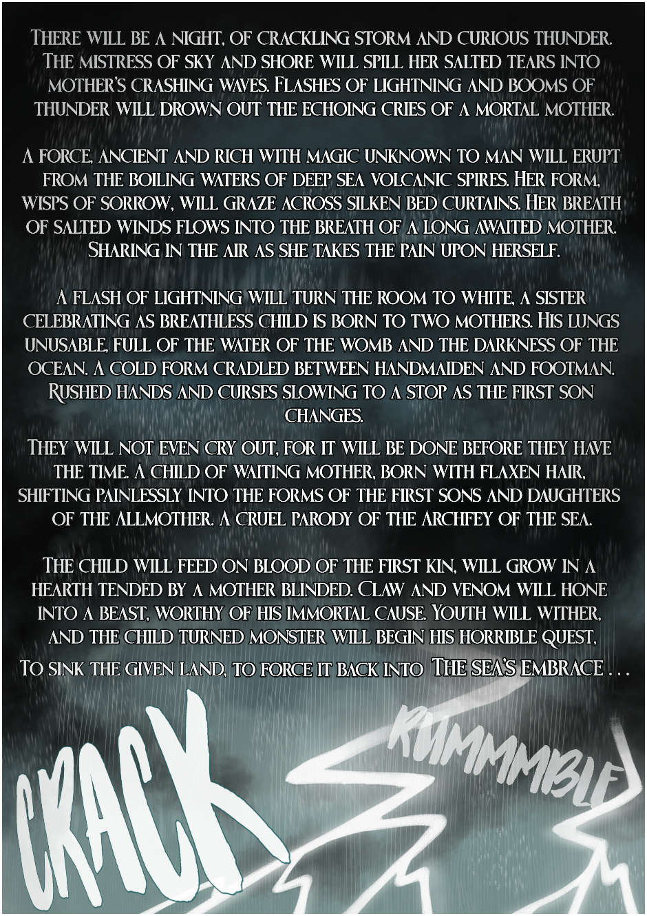 "Fed on blood of first kin, grown in a hearth kept alight by a mother blind to his monstrosity. Claw and venom honed to become a beast, worthy of his immortal cause. his youth slipping away with each death, so he can begin his horrible quest to sink the land into the ocean once more . . . "