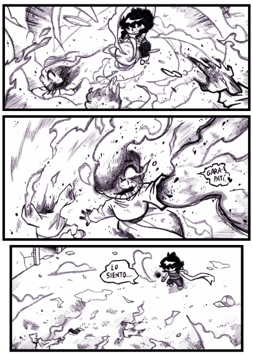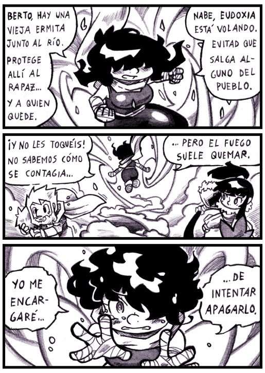 Act 1: Los afectados por la maldición piden agua, pero el fuerte de Aurelia está en la magia de viento y de gravedad, y con ellas es capaz de hacer... vacío. Una buena forma de apagar el fuego es dejarlo sin oxígeno.