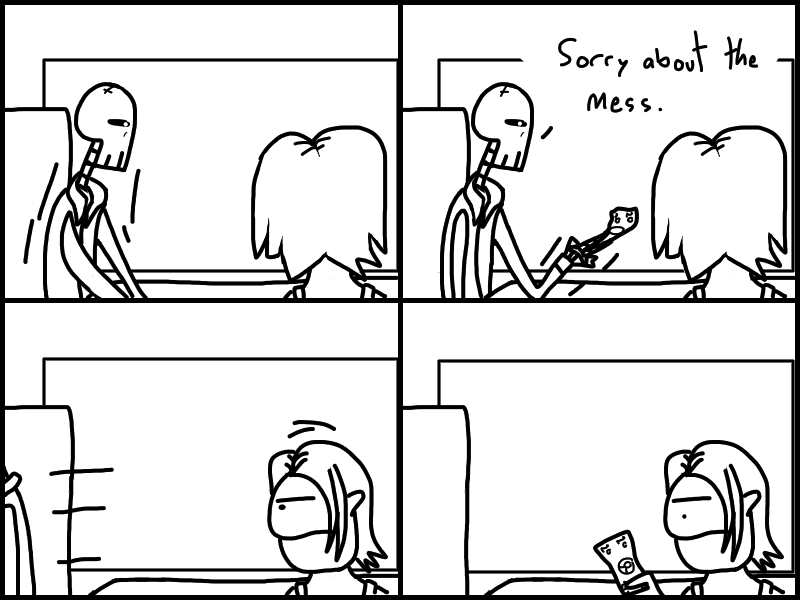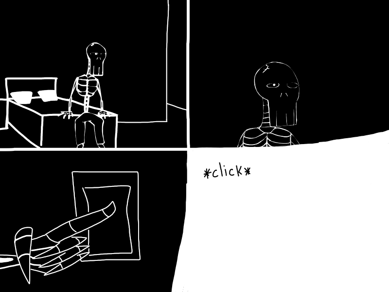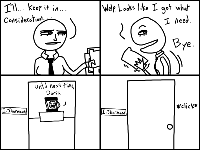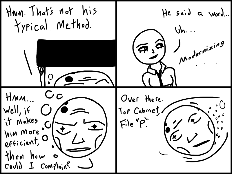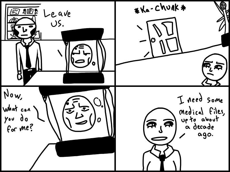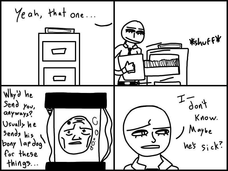 Doris goes to Jharmann for some EVIL files and has an EVIL TALK with an EVIL MAN. Skeleton's gotta lotta stuff to think about. Think about what? READ IT to find out!