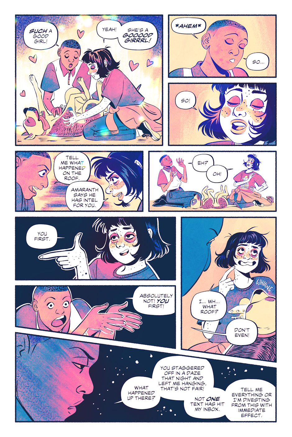 In the distant future, Earth as we know it has crumbled, destroyed and now dominated by mysterious monsters called 'angels'. Safe and sound inside a shielded bubble city, one scruffy queer girl with delusions of heroism stumbles her way through life as a loner. Now that she's found a brand new best friend, life can only get better... right?
