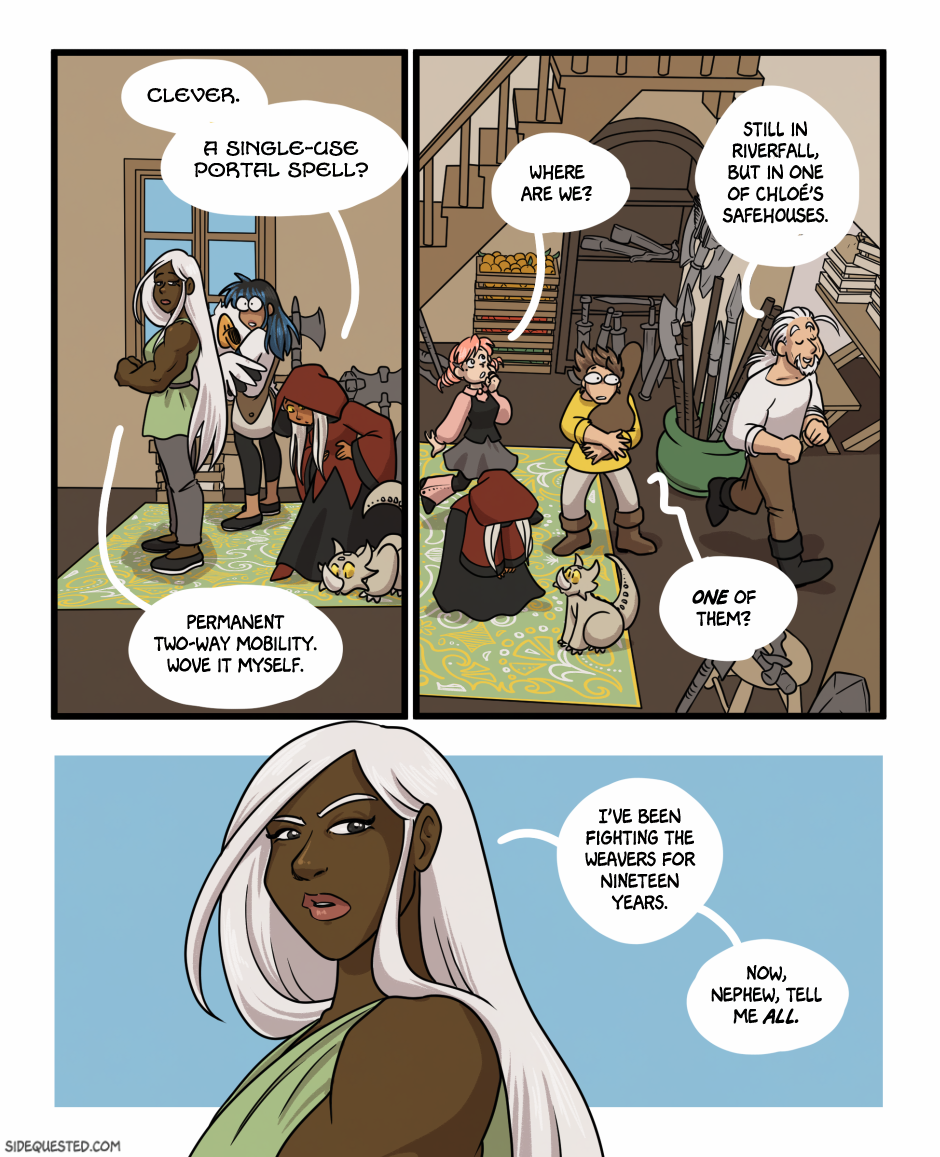Ok this is getting juicy why has she been fighting the weavers for 19 years? Standing up to any monarchy is a big deal even when the leaders in terms of physical abilities are fairly normal but neither side in this case is normal. A large group of magic users going against someone who specializes in magic and physical abilities and fighting is no easy task. And how easily can she teleport to one of her safehouses? Is it even difficult at this point for her? Tho given that she's immediately asking leo for what info he has and is probably going to avoid a lot of questions aimed at her it can't be so simple that the weavers can't touch her and being more of an inconvenience than a threat so they must be pretty serious