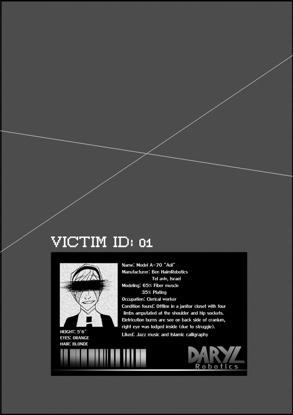 A short intermission to explain the many models of robots in this comic and an ID of the victim from chapter 1