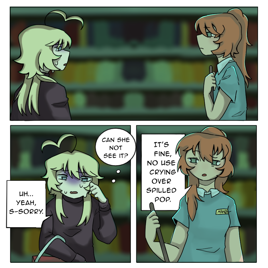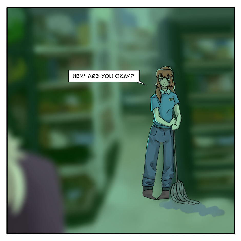 The fluorescents are buzzing, and our character goes a little grocery shopping, but they meet an uncomfortably familiar face.