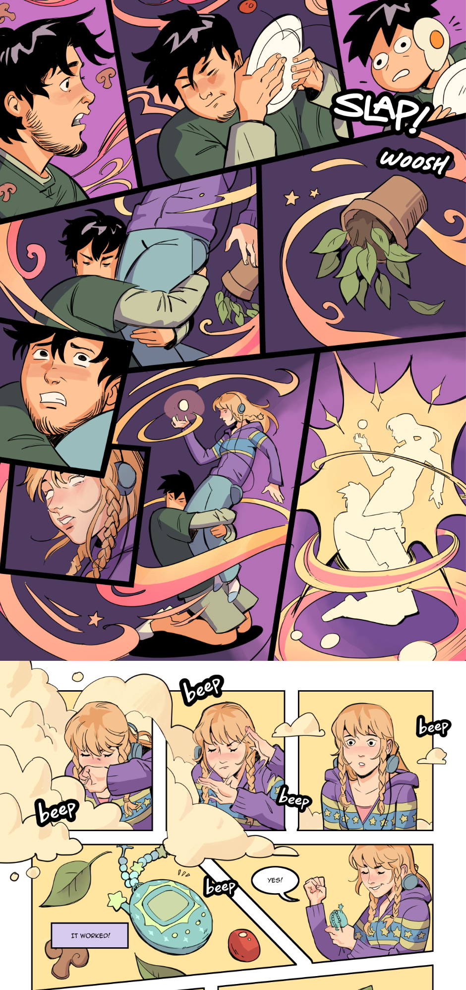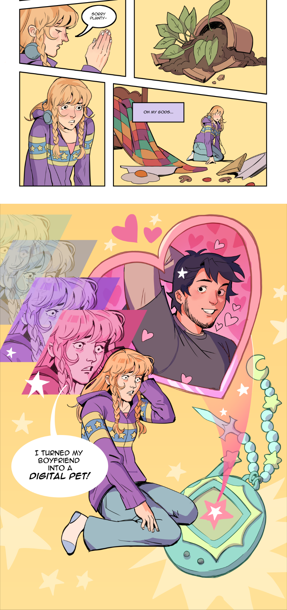 A tale of a tired witch, Fiona, who accidentally traps her boyfriend, Paolo, in a digital pet. Set in a Y2K drenched fantasy world, Fiona travels across her town, and her mind, to find the key to releasing her love from the chains of her childhood companion.