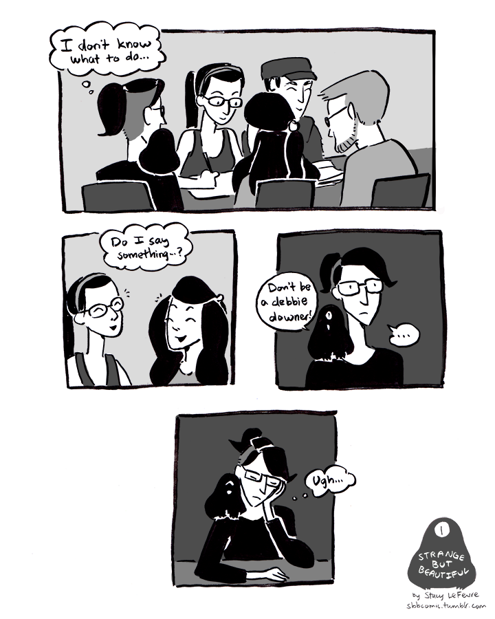 Hey just wanted to say thank you for putting up this comic. I too deal often with anxiety and depression. I think the thing I like best about your comic is it reveals just how persistent the creatures are. A lot of people, even the best intention ones I know, often think once you've "beaten" it once it goes away forever. Like some kind of life epiphany will just eliminate it totally. Then they get confused when a month later you're reeling once more. Heck, I get confused that it keeps coming back.