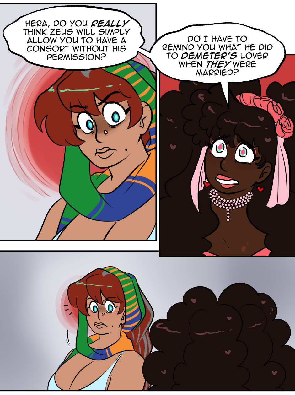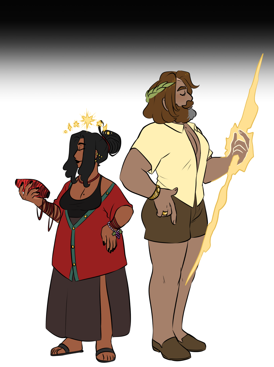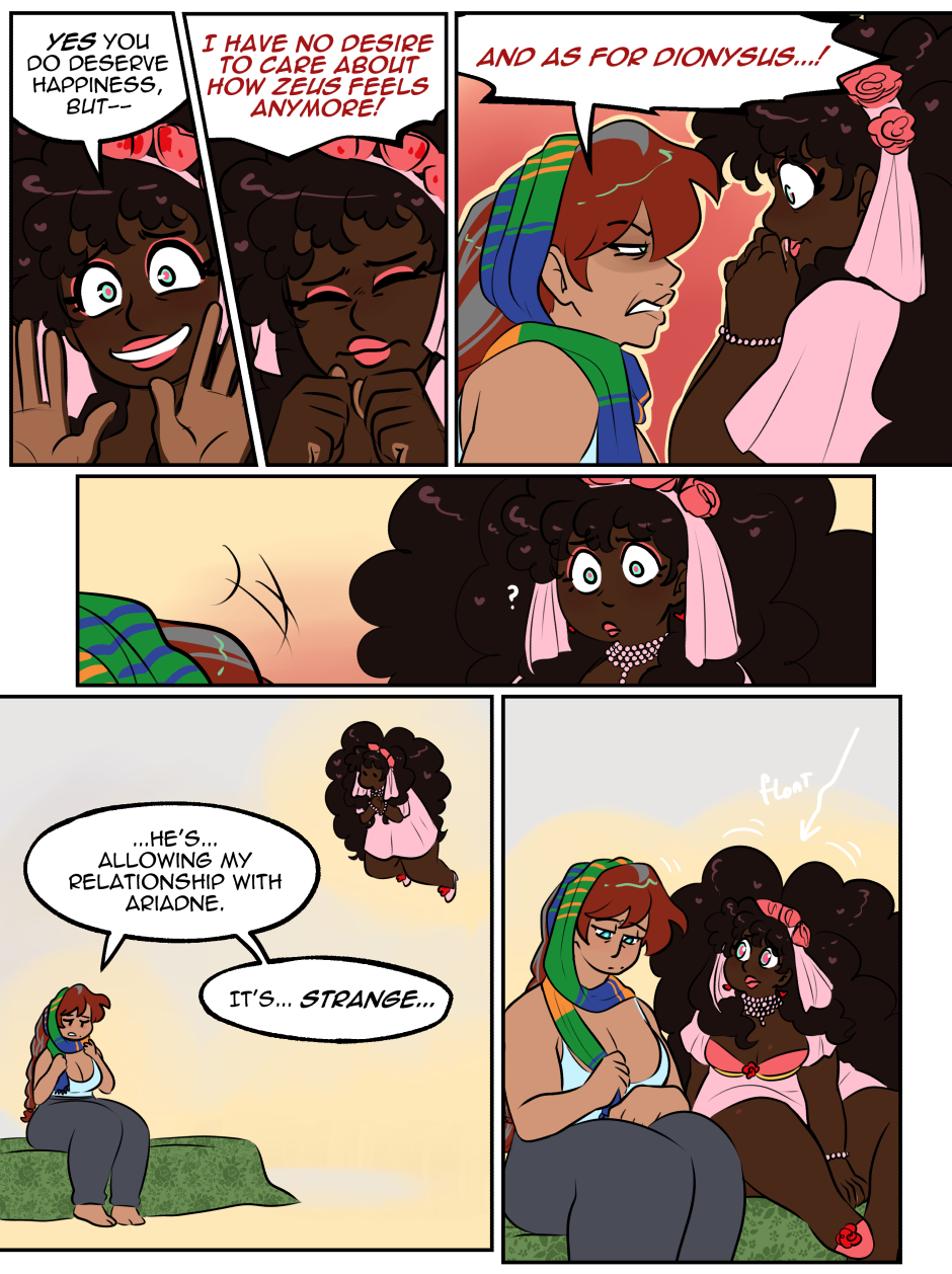 Evoe is a Greek Mythology webcomic that focuses on Dionysus, god of wine, and Ariadne, goddess of the labyrinth, and their new situationship with Hera, Goddess of Marriages and Queen of the gods.