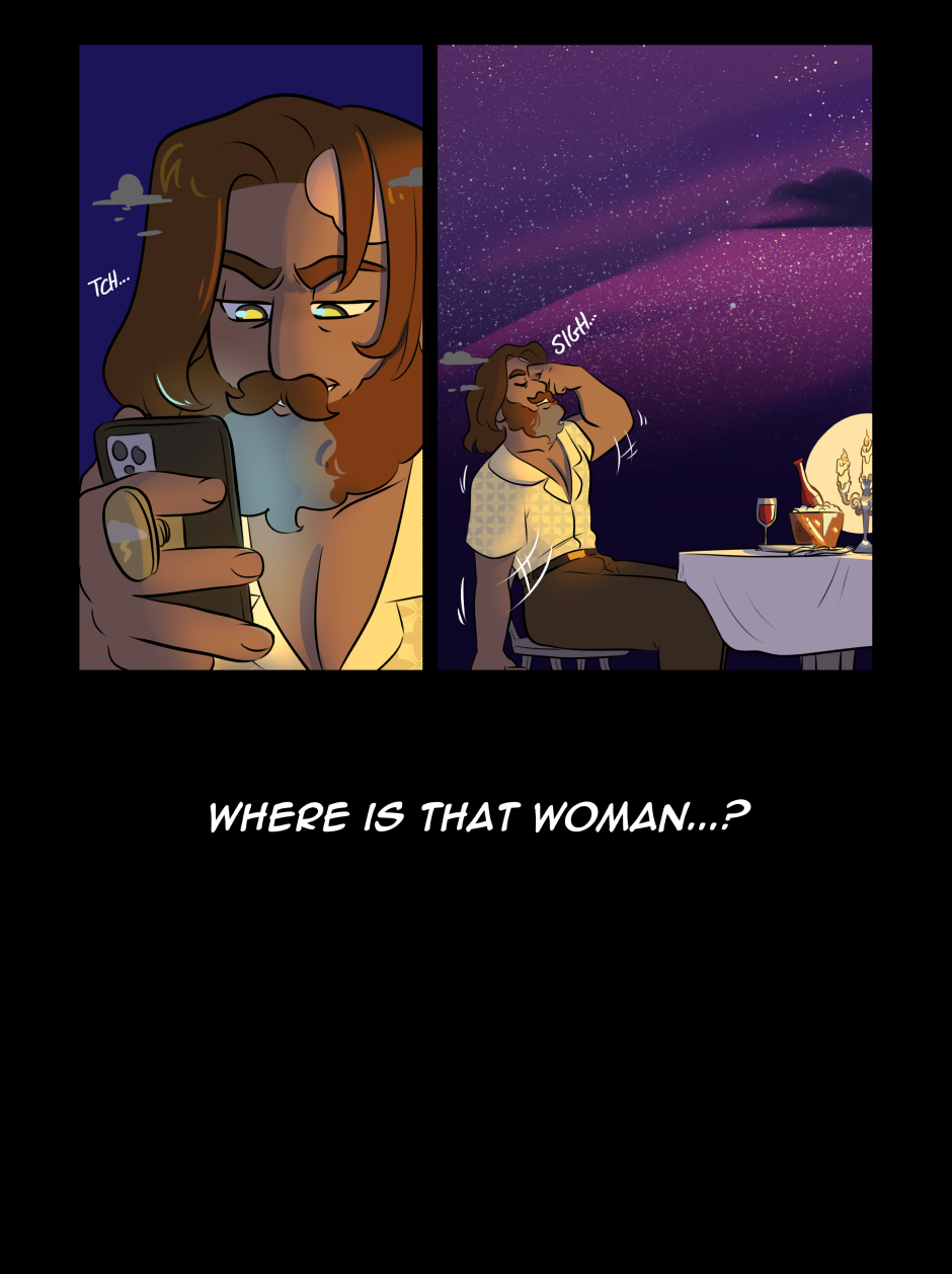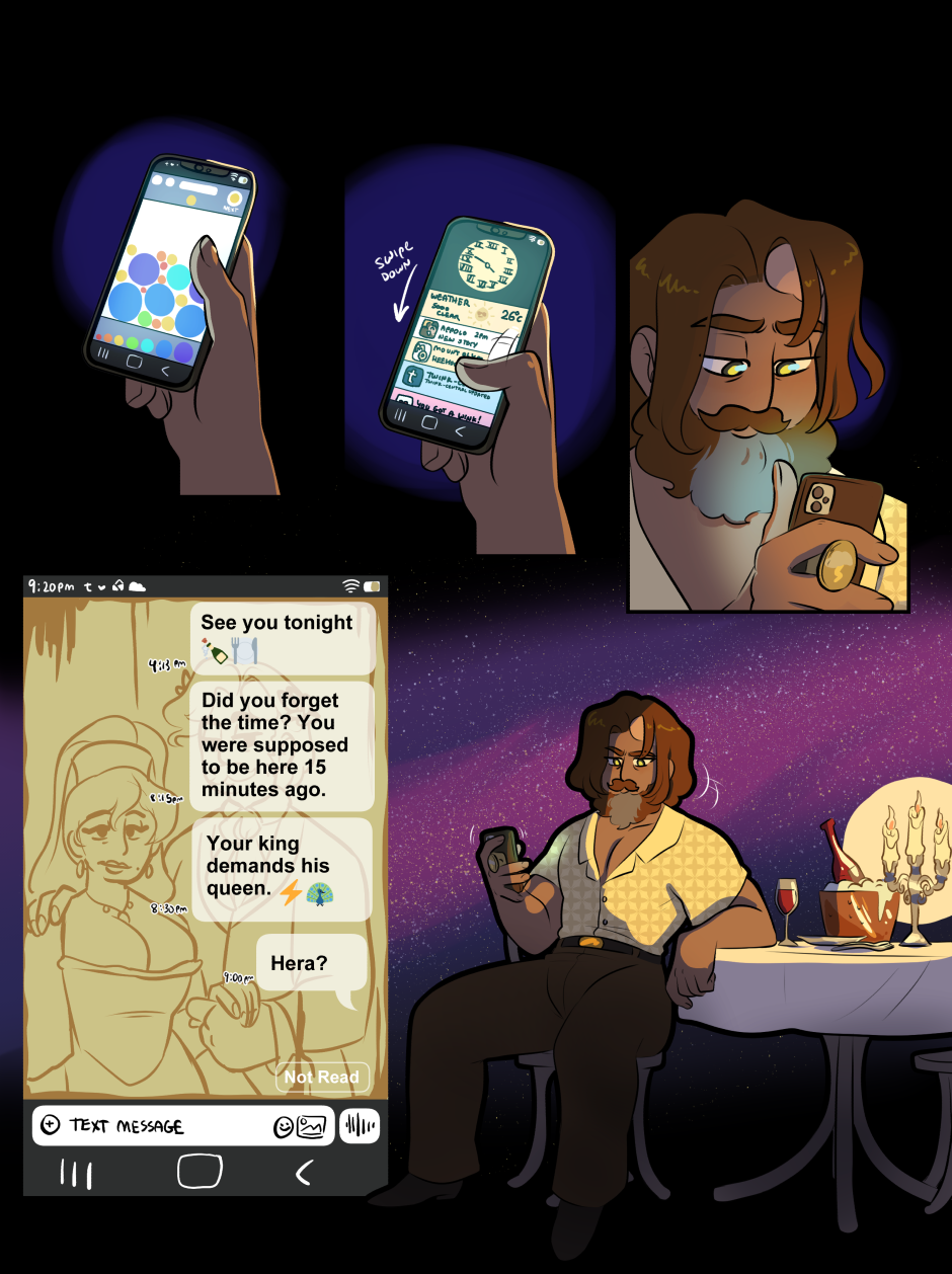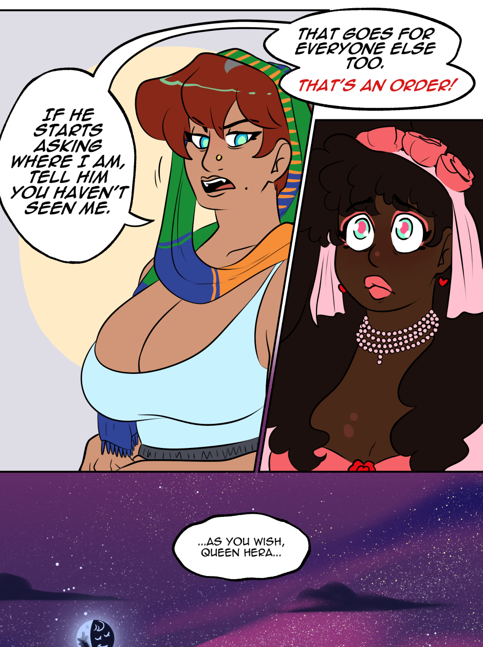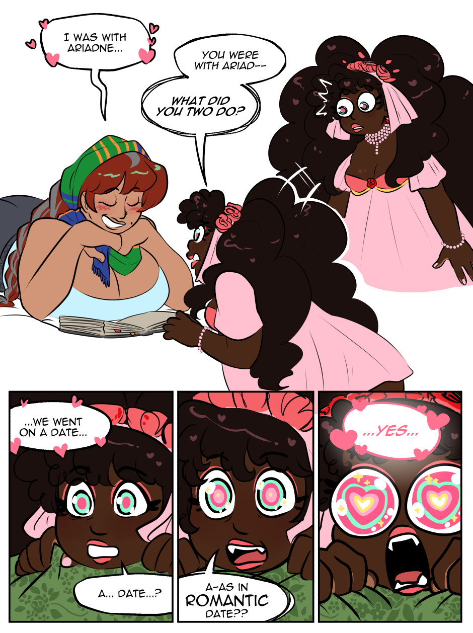 Evoe is a Greek Mythology webcomic that focuses on Dionysus, god of wine, and Ariadne, goddess of the labyrinth, and their new situationship with Hera, Goddess of Marriages and Queen of the gods.