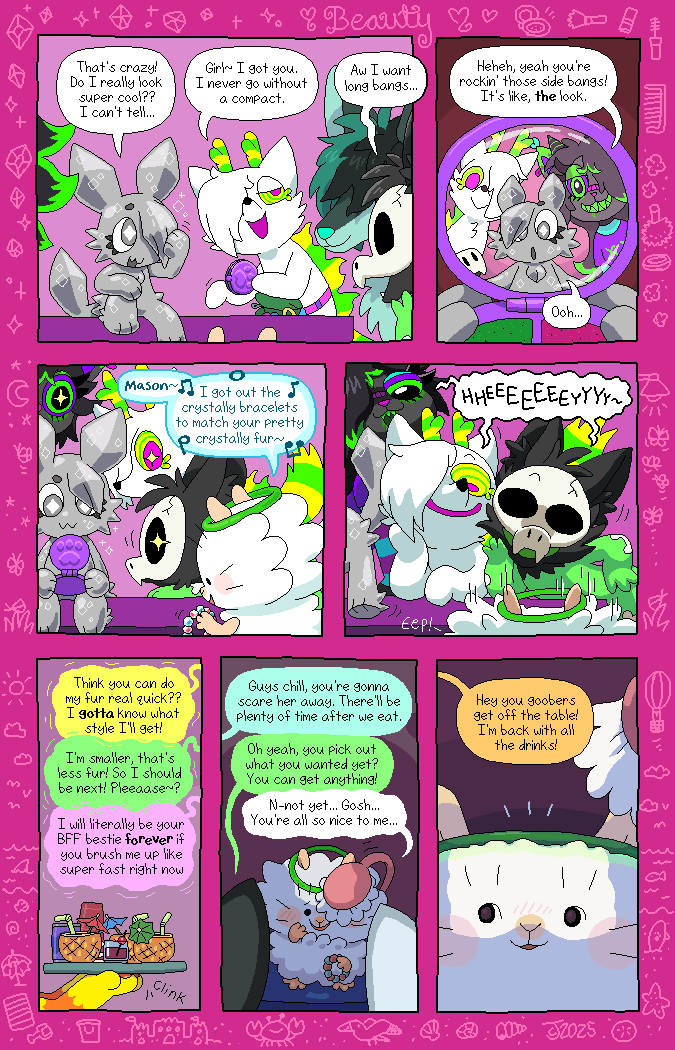 Most of the character designs were bought (adopted) from children on DeviantArt, resulting in a colorful cast of cats and dogs! The comic was made to be a love-letter to the creative minds of these kids. Credits to the original designers will be in the page description as they appear. The comic is all-ages.