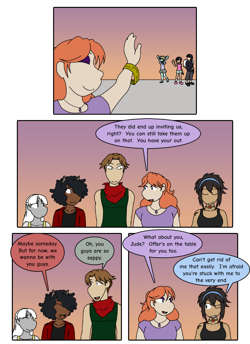 I wanted to close this sequence on a warm note. Though their initial goal was to steal from the kids of Golem Hall, they ended up returning everything (except the plushie that Verity offered), and became friends with them instead. They're going their separate ways for now, but I think this mostly ended up being a positive experience for most of the kids involved.