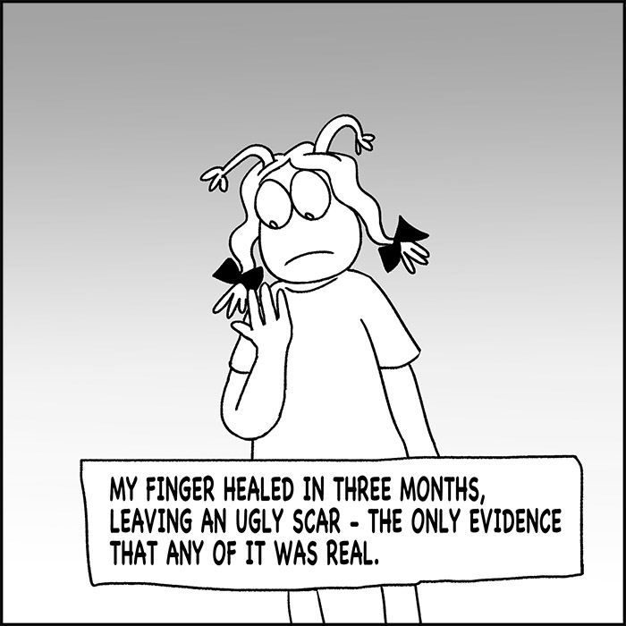 I should add that it wasn’t so much consideration for Mom as fear of treatment that kept me away from home for about an hour, but it really wasn’t stopping. I remember the small, long piece of glass as it left my hand and carved out a strip of flesh as it flew away. I saw a piece of my finger lying on the ground. It was super gross.