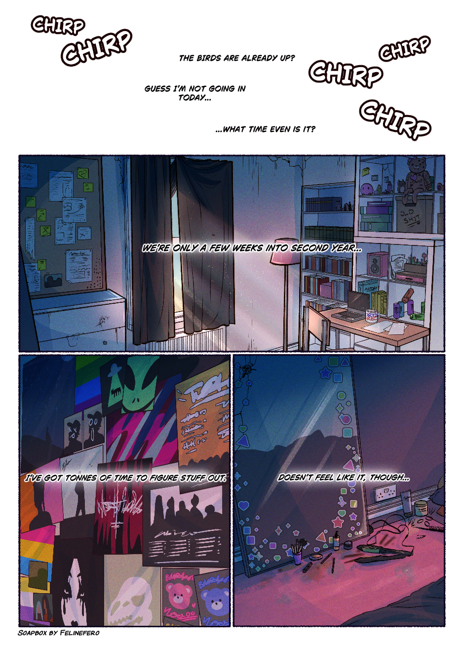 SOAPBOX is set in the early 2010s and follows Lars (they/them), Bram (he/him) and their ragtag group of queer friends as they try their best to figure out their futures, who they are, cultures, friendships, relationships, attraction and the whole world; all while trying to find their place in it.